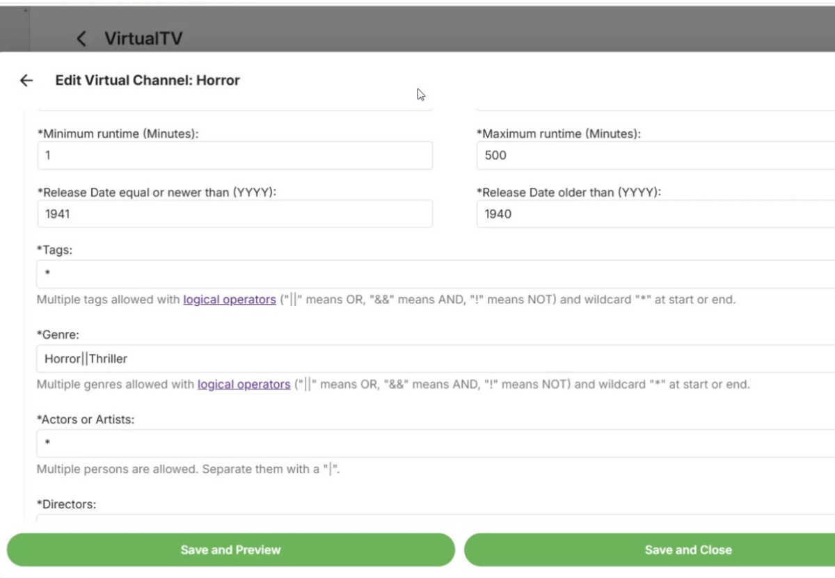 I’m having trouble with the filtering for genre Director and studio. Any help for that would be greatly appreciated. The only way I can get my channels to show up is to do playlist and collections. If possible I would like to be able to do that encompasses all of my stuff but filters out for what I want to be in my channel versus having to create a another playlist or another collection just to create the channel. Can you go over those type of filters for me? So far, I really love the option for the channel.