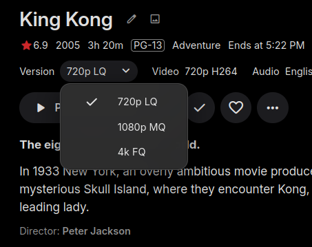 I have two versions of each movie that are capable of direct play in Firefox: a 720p MP4 (H264/AAC) and a 1080p WEBM (VP9/Opus). The 720p version is always displayed as default, even on screens that are capable of 1080p or better. Is this the expected behavior? It's not really a big deal, but I was under the impression that Emby picks the best fully compatible option for the player as the default. It would be nice if it did that in this case.