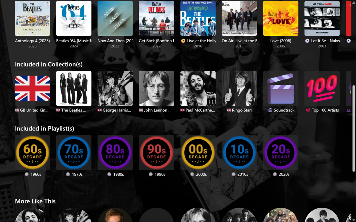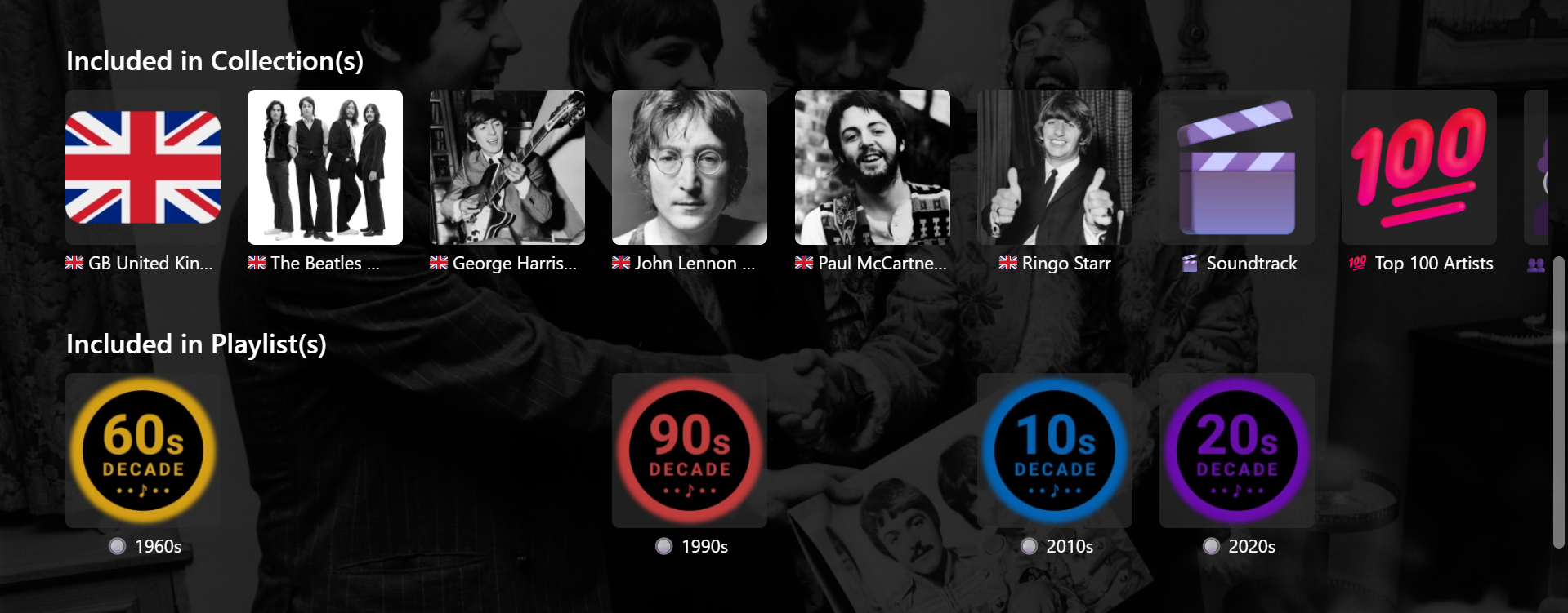 @GrimReaper This version works much better. Just had to fine-tune a couple of things. Needed my local server number in place of yours and had to change the 202px spacing to 145px. Not sure why (????) as DevTools showed 202px. Also played around a bit with CSS for hiding individual selected Playlists as follows (e.g.) /* 1970s */ .appearsOnListsSection .virtualScrollItem:has(img[src*="/Items/688474/"]) { display: none !important; } But, then the hidden items need to be sorted to the end of all Playlists, otherwise blank spaces occur. Probably not a problem for me though, as my Playlists and Collections are sorted into sub-categories anyway and would only ever be shown or hidden as a set, according to these categories. There's probably some combination of splitting the row into two and hiding selected items on certain pages that will end up being useful. Thanks and Cheers !!