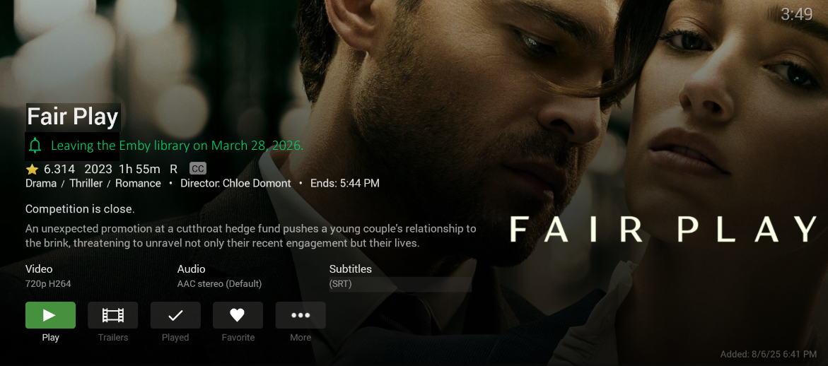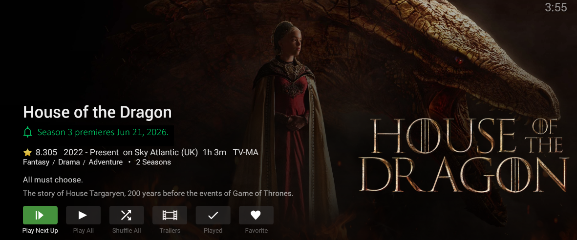 I would like to to request a notification feature that displays a one-line message for a media item (movie or TV show) details page. Admins should be able to manually set a custom message for specific movies or shows. For example, on a TV show like House of the Dragon, the message could be something like “Season 3 is coming soon” or “New episode on Monday.” I have attached images (photoshopped from Android TV and web client screenshots) to illustrate how this should look.