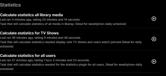 well, good news... so i restarted emby to let it do the update on the statistics plugin and then i ran all 3 scheduled tasks for statistics and everything went good and finished. i also checked the user statistics and everything loads up and is upto date. So i have no freaking clue what went wrong but all is good now. thanks for the replies and the help @hackthis02