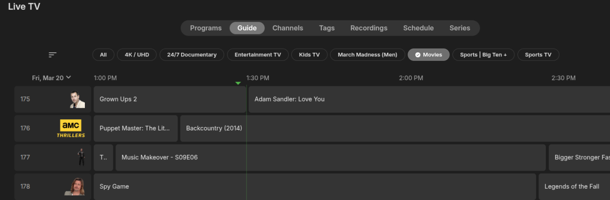 Is there a way to get the categories to display on the Firestick app, similar to how they do on the web app? when I click sort it lets me select categories, presumably to display, but the actual categories do not display and I just have a guide of ALL channels