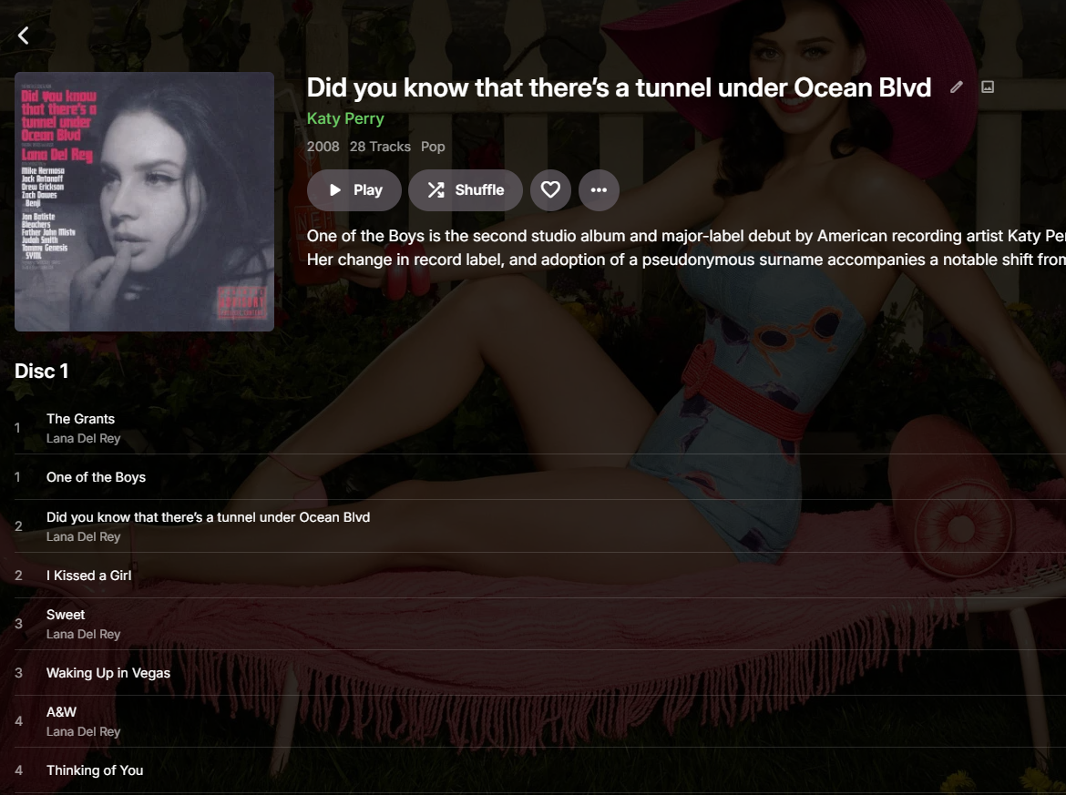 I have these two albums: K:\Media\Music\Katy Perry - 2008 - One Of The Boys ... K:\Media\Music\Lana Del Rey - 2023 - Did you know that there’s a tunnel under Ocean Blvd Both these albums have their Artist and Contributing Artist and Album set accordingly. The years also match and track numbers are applied correctly. I don't know how, or why. Emby merges these two albums into some kind of amalgamation, using the cover from one, the artist name from the other and just bunches these two random folders together: I've already tried to: Rename folder Move all songs of both artists out of the library, scan, and add them in one by one and scan Moved the folders to different parent foldes (so they have their own artist parent folder), scan Remove one artist, scan, add artist back in, scan Manually edit the ID's (they always point to either one or the other) An example of the files (within mp3tag) are: This issue is driving me absolutely bonkers. Any clues?