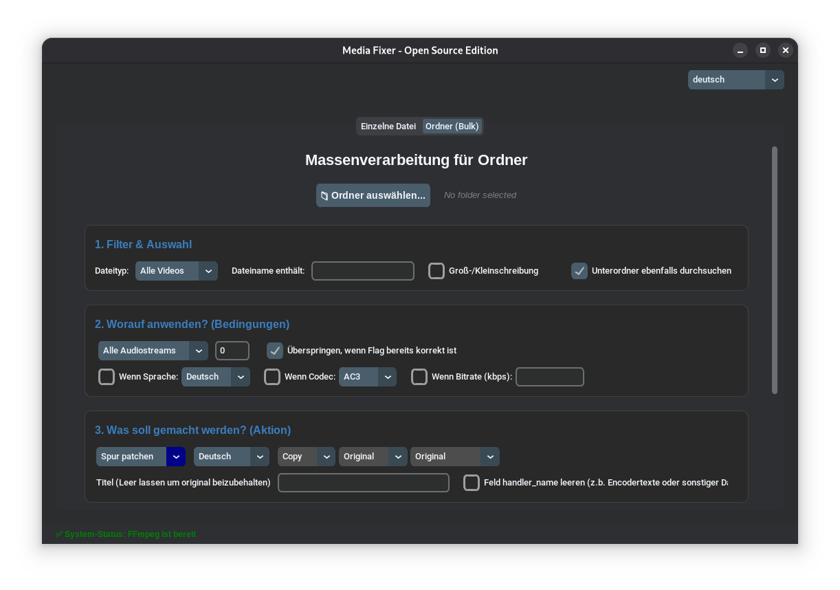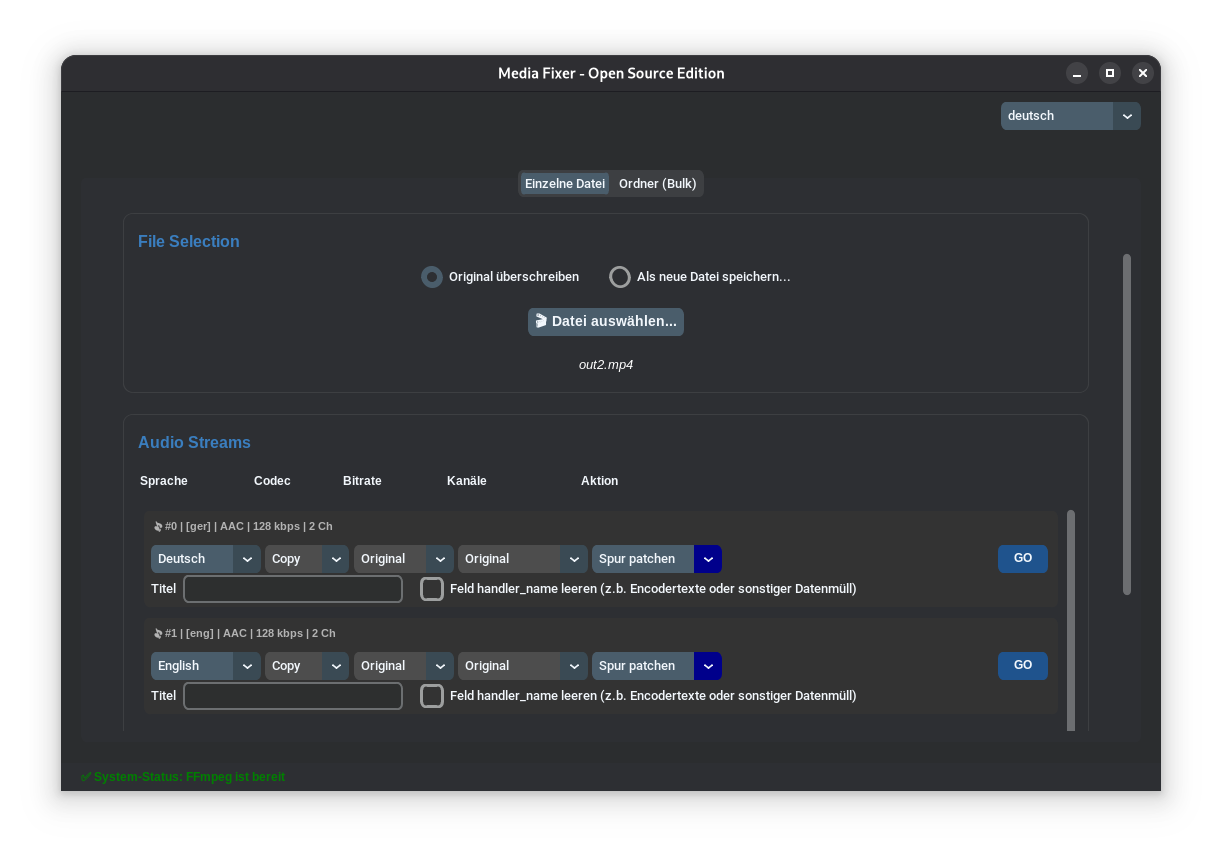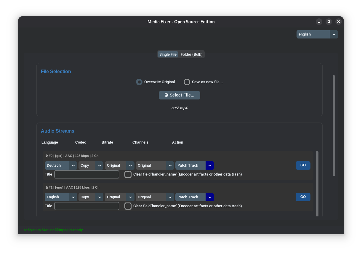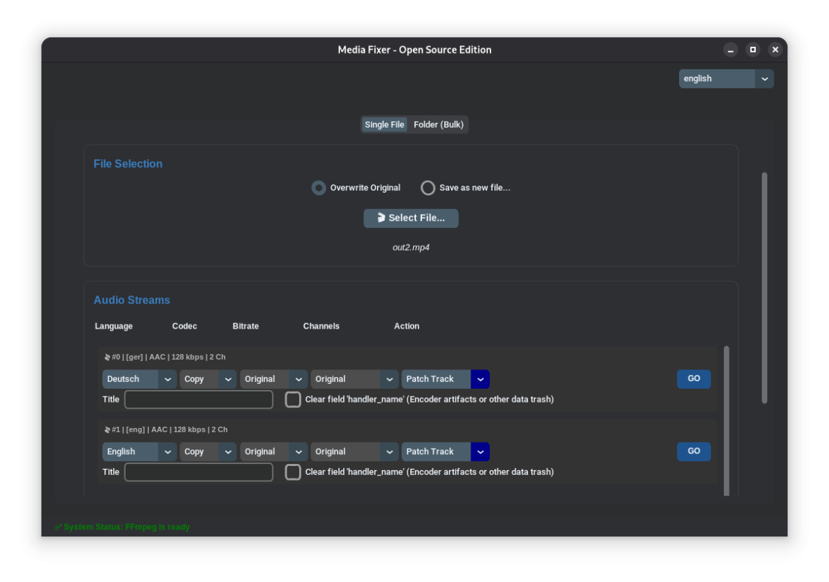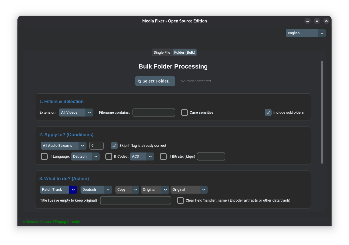 Hey everyone, I wanted to share my new project with you. Originally, I just wanted to automate adjusting the audio tracks of several of my videos, changing the title and language flag, and maybe even the codec. With a little help from AI, this program has now emerged: MediaFixer (Download on Github) View on Github Key Features Bulk Audio Patching: Convert all audio tracks in a folder to a specific codec (e.g., AC3, AAC), change bitrates, or force a stereo downmix for maximum compatibility. Fix Language Flags: Batch-apply the correct language tags (English, German, etc.) so your media player automatically selects the right audio track. Metadata Scrubbing: Easily rename track titles or completely clear out hidden data-trash like handler_name tags left behind by encoders. Safe Simulation Mode: Never ruin your library. MediaFixer offers a simulation mode that previews every single planned change in a detailed log before a single byte is written to your drive. Zero Config Setup: No need to mess with terminal commands or manually download FFmpeg. The built-in setup wizard handles everything for you on the first launch. Modern UI: Built with an intuitive, dark-mode GUI (Rime Theme) that supports both English and German natively. I know there are server tools that automate many things, but I wanted to have direct control over what happens! I would appreciate your feedback.