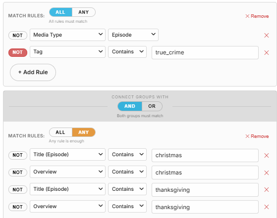 @soderlundThis is looking really good. The filters for Title (episode) and Overview are working nicely. Although I have run into one problem. For example, the desired outcome below would filter Episodes that are not from a show(series) tagged "true_crime" that has the keywords "christmas" or "thanksgiving" in the overview and/or title (episode). Since I tag a show (series) as true_crime and not individual episodes this tag is excluded from the results. The smart playlist plugin handled this with a technique it called "Tree Crawl". I understand this would mean it would crawl up from the episode through to the series and match on the shows(series) tags if you chose "Tag (Tree Crawl). It had this as an option for other filters as well, for example, genre (tree crawl). I wonder if this is something you would be interested in trying? Also would it be possible to enable a way to enter multiple keywords, tags genres, etc. perhaps separated by a comma or other symbol? comedy,horror,drama comedy|horror|drama Again thanks for this plugin. It is fantastic so far!!