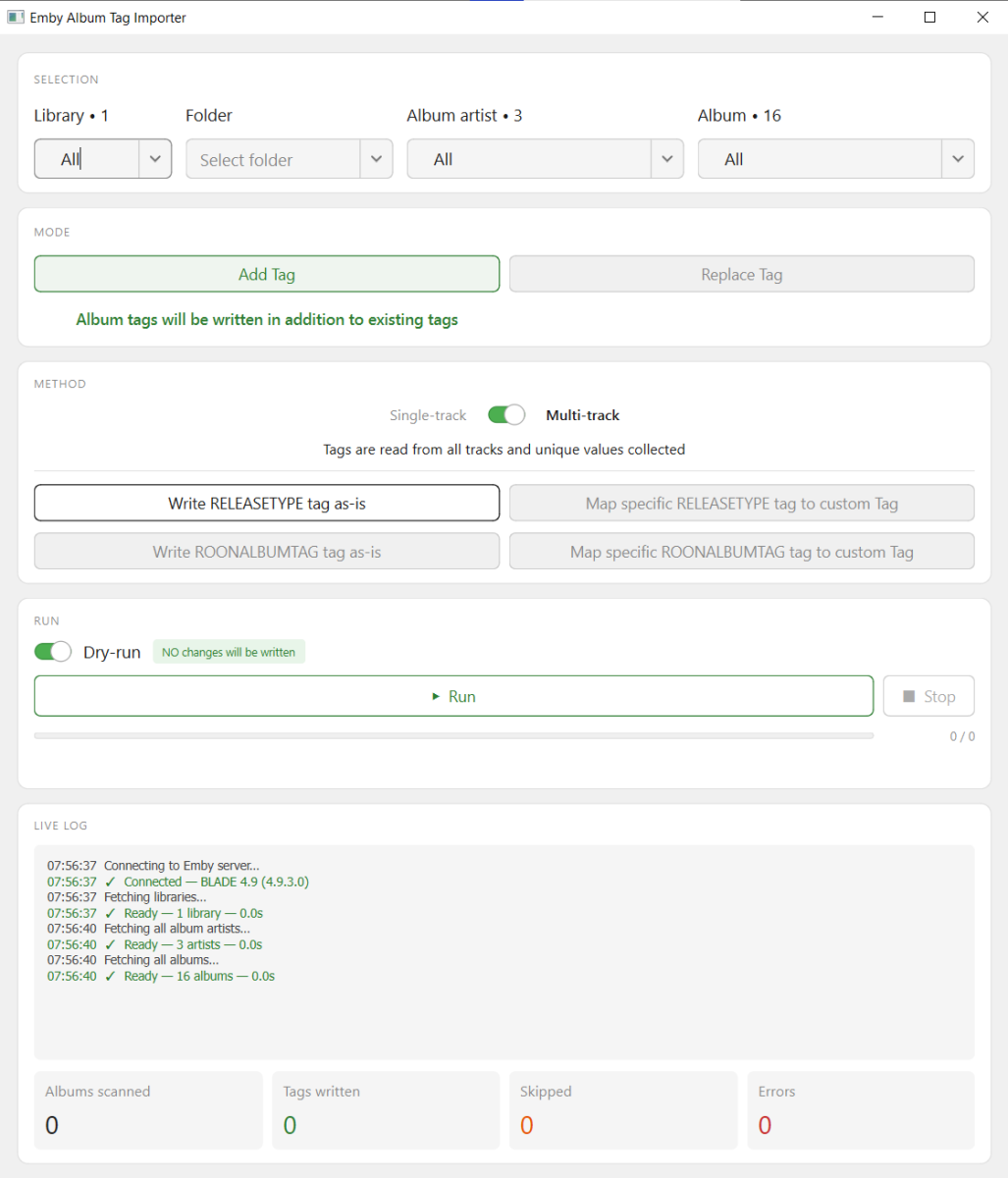 Give this version a spin. v0.4 - Selection logic revised - Track modes added (Single-track/Multi-track) Edit: Also, any glitches observed in Summary modals? emby_album_tag_importer.py -
