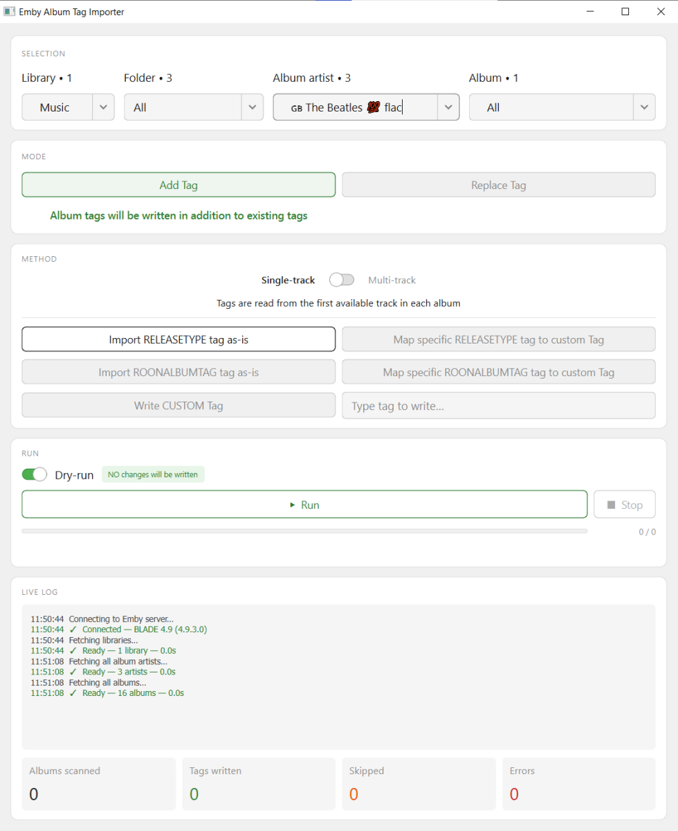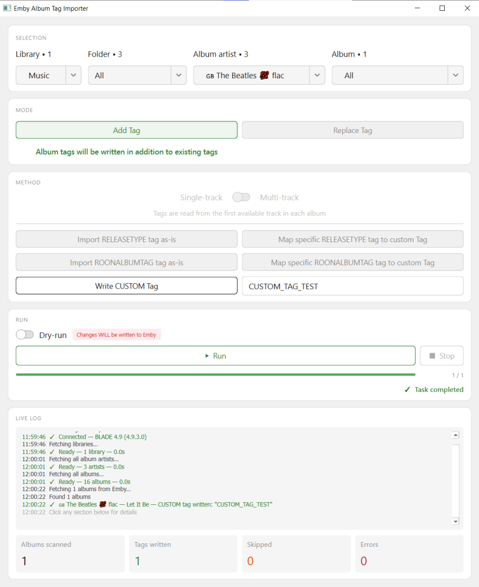v5 !!! Super Speed Demon !!! v5 (perhaps shoulda been v8 ???) Mp3tag: 6min35sec writing 1 tag to 1270 tracks over wireless network doing several other things. Emby_Album_Tag_Importer: 0min8sec writing the same 1 tag from, single Album track, on same network All Artists problem is fixed - now just Album Artists. Reports can be generated and exported for Excel (just a quick test so far). Error logging works as follows (from earlier today): There was a massive long path. A long Disc subfolder under the main Album folder, plus the track_name.flac. It seemed to be only 220 characters (under 260 limit?), but I shortened the overall length to 110 chracters and all was good! -