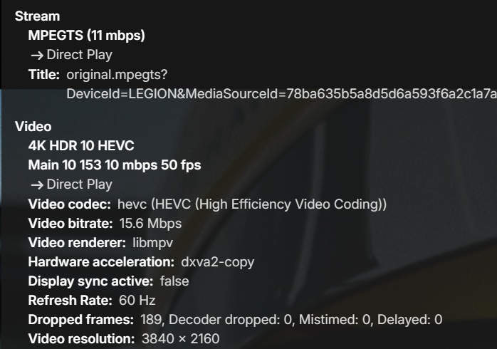 Hello, With Emby TVOS 2.03 on my Apple TV 4K, movies play perfectly in 1080p. However, as soon as I play a 4K movie with Dolby Vision, the colors and exposure become dull and flat.The same movie plays correctly via Infuse or Plex (on the Apple TV 4K). In all cases, it’s direct play. If relevant, here are the details (it is an MKV file): Title 4K Dolby Vision HEVC Codec HEVC Dolby Profile Profile 8.1 (HDR10 compatible) Profile Main 10 Level 153 Resolution 3840x2160 Aspect Ratio 16:9 Interlaced No Frame Rate 23.976 Bitrate 63 Mbps Video Format Dolby Vision Primary Colors BT.2020 Color Space BT.2020NC Color Transfer SMPTE 2084