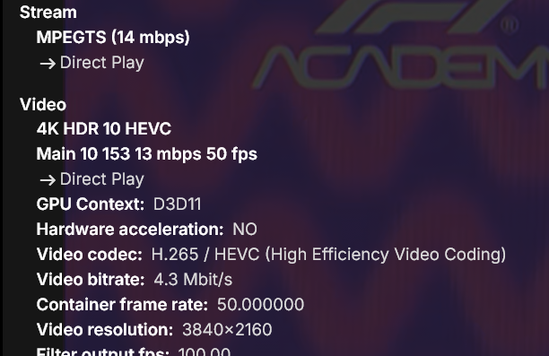 Here's my setup: Emby server 4.9.3.0 in a docker container on UnRaid. No GPU on it and transcoding set as desired Emby Theater 3.0.20 on Windows 11 home playing a 4K Live TV stream from server above Emby Windows 2.234.2.0 on Windows 11 Pro streaming the same 4K Live TV channel from server above Here's the Stats for Nerds from Emby Theater. As you can see Hardware acceleration is dxva2-copy. Stream is playing fine and CPU usage is low Here's the Stats for Nerds from Emby Windows. Notice the Hardware acceleration is set to NO. Stream is playing fine except CPU usage is through the roof So, how to set proper hardware acceleration on Emby Windows ?