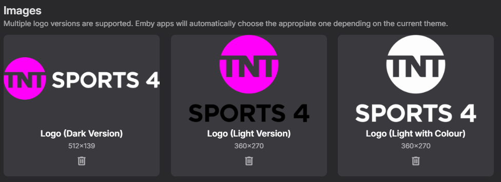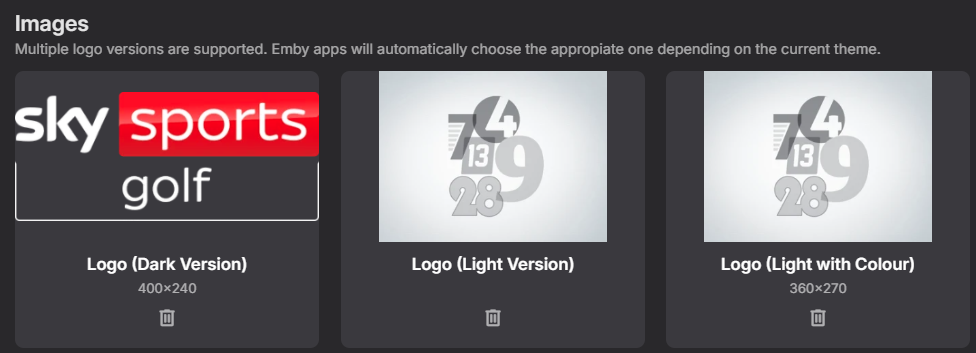 Hi all, Bit of a weird one here. I've been making some changes to my IPTV setup recently and have an annoying issue going on with the channel logos. I was previously using IPTV Boss to output an m3u channel list and then matching these channels to the Emby Guide Data using Sky Q (London SATELLITE) E1 Postcode as the Lineup, this worked fine in terms of channel logos for about a year. I've recently setup Dispatcharr and now I do the same as before but just with a Dispatcharr creating the m3u file instead of IPTV Boss. I'm using the same guide data and linking it to the same channel number I did with the IPTV Boss setup but now in the channel guide "light with colour" logos are being used when I have a dark theme set. Also the Sky Sports Golf light logos seem to be incorrect. I haven't added a server log output at the moment as I'm not sure if that will show anything helpful for this. But I have included a number of screenshots below to show what I mean. 406 is Sky Sports Golf - See below for the 3 images scaped. The 4 TNT channels are all also using the "Light with Colour" logo, but for some reason TNT 4 is white. And also the "Dark Version" of the TNT logo is smaller vertically so I would prefer this as it makes the channel block narrower which is what I had before as it seemed to default to the "Dark Version" Editing the Sky Sports Golf channel Logo from the guide view: Editing the TNT 4 channel logo from the guide view: These are my display settings for the user. I assume it's meant to pick the logo based on the theme. I have also tried setting the settings theme to dark just in case. I've tried deleting the images from the edit view and then refreshing the guide data and the same thing happens. The logos also display that way for all users I have setup and I've tested from my laptop browser and also from the Android App on my phone and they show the same. Does anyone have any ideas on this as it's annoying me even though it's not breaking functionality. Thank you, Liam