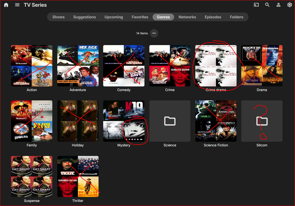 See the pic. The montage images are from my movies, from stuff outside of the TV Series library (X-ed). Some of the images are from media I don't even have (circled). And I do have sitcoms yet the sitcom montage is null. Some of the the genres don't have anything assigned to them (nothing for that category), but you can click the play button and something plays. None of this makes sense.