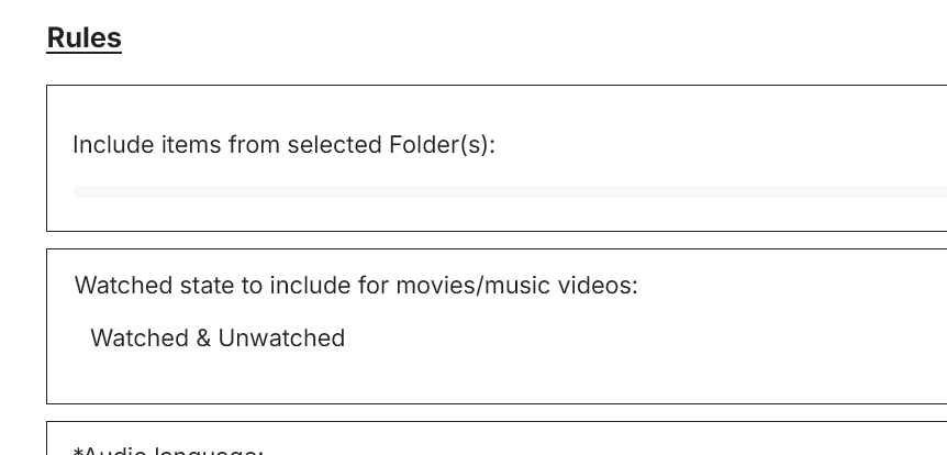 Last Played, All Users, > 1095. That should return all movies that have not been watched by anyone in the last three years. That obviously includes all movies that were watched more than three years ago. But does it also include movies that have not been watched at all? Those movies have also not been watched in the past three years, and by that logic should be included, but they haven't been watched more than three years ago, and by that logic should not be included. I think you're just thinking of it in terms of Last Played LESS THAN, whereas I'm looking for Last Played GREATER THAN. What I have now is: Last Played, All Users, > 1095 OR Unwatched, All Users AND Date Added > 1095 My goal is to resurface things that have been forgotten about. But if the first rule returns items that have never been watched, then either the second rule is redundant or the first rule will surface things that have never been watched but are newer than 3 years.