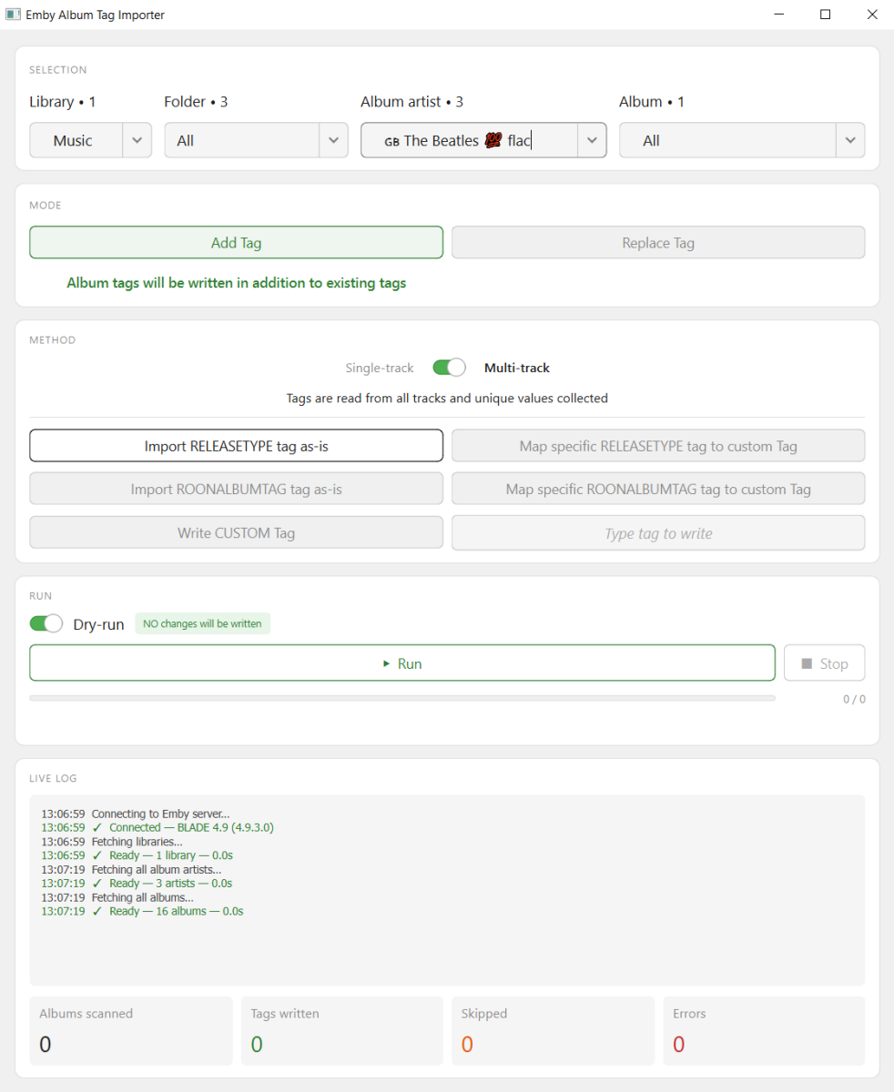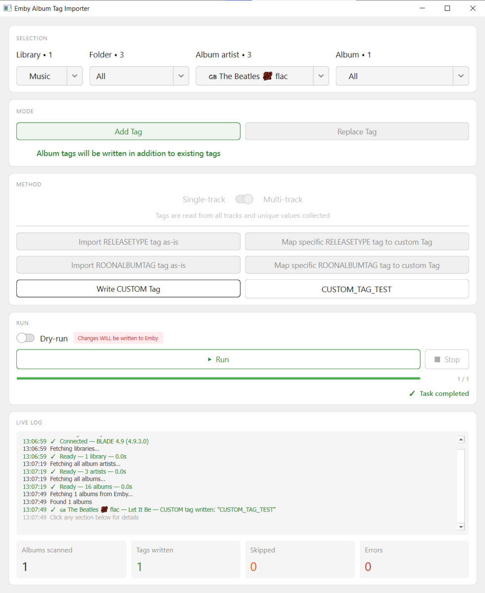v5 !!! Super Speed Demon !!! v5 (perhaps shoulda been v8 ???) Mp3tag: 6min35sec writing 1 tag to 1270 tracks over wireless network doing several other things. Emby_Album_Tag_Importer: 0min8sec writing the same 1 tag from, single Album track, on same network All Artists problem is fixed - now just Album Artists. Reports can be generated and exported for Excel (just a quick test so far). Error logging works as follows (from earlier today): There was a massive long path. A long Disc subfolder under the main Album folder, plus the track_name.flac. It seemed to be only 220 characters (under 260 limit?), but I shortened the overall length to 110 chracters and all was good! -