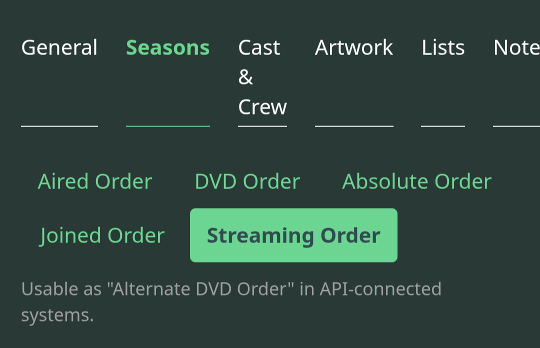 In the client, for series, we have the options Aired Order, Absolute Order, and DVD Order. It works 99% of the time. However, in SpongeBob SquarePants (1999), on the tvdb website, there are also Joined Order and Streaming Order. There they say "Usable as 'Alternate Order' in API-connected systems". In Emby, I don't have these two other options, causing the order to be incorrect. Could you please add these options to the metadata? Here you can see what I'm talking about: https://www.thetvdb.com/series/spongebob-squarepants#seasons Thank You.