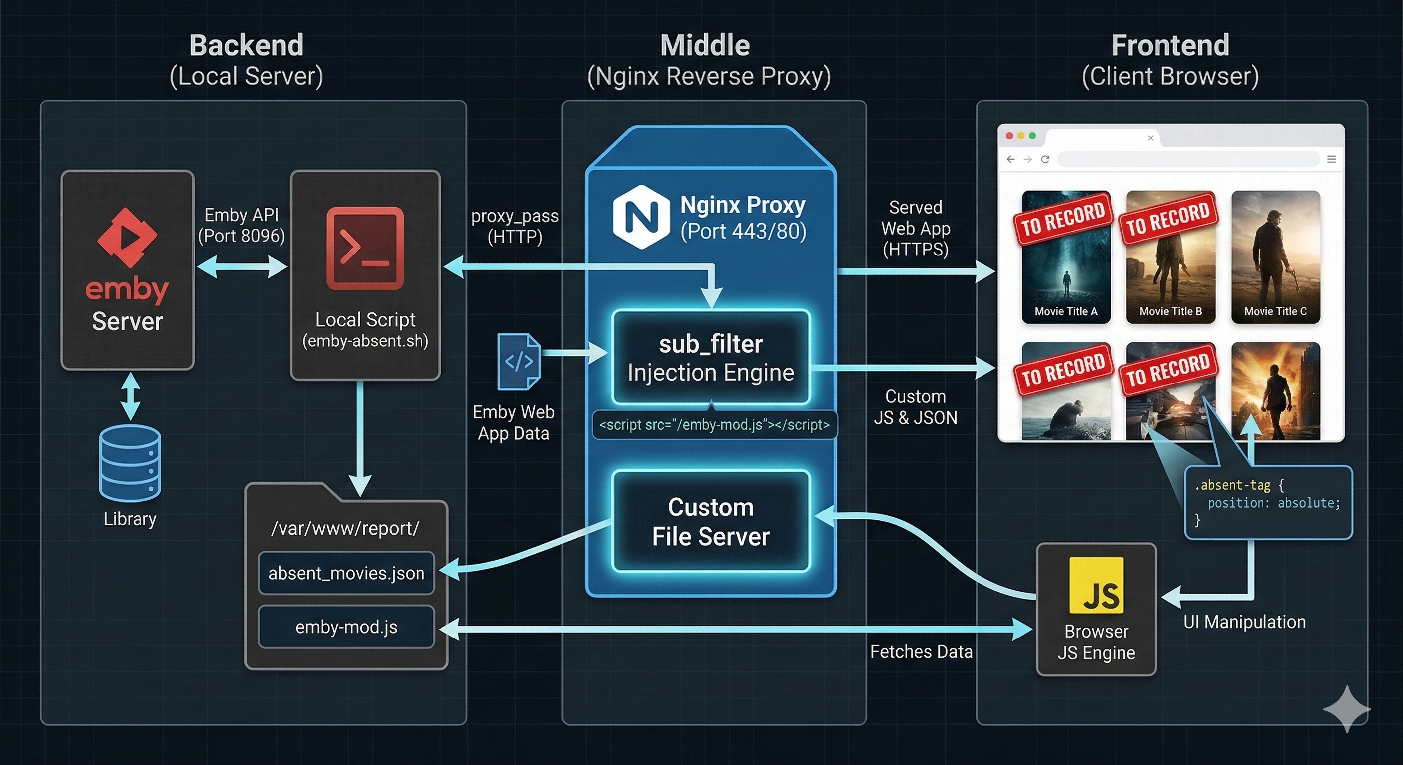 Visual EPG "Not in Library" Indicators using Nginx and API Scripting This solution uses a small bash script and an Nginx reverse proxy to inject a visual "TO RECORD" tag directly into the Emby web interface for any movie found in the EPG that isn't already in your collection. How it works: Backend Script: Compares your library against the EPG via the Emby API. JSON Output: Saves a list of "missing" movies to a web-accessible folder. Nginx Injection: Automatically inserts a small JavaScript file into the Emby web app using sub_filter. UI Update: The script scans the page and adds a red badge to any matching movie titles. 1. The Automation Script (emby-absent.sh) This script generates the data. Place it in /usr/local/bin/ and ensure jq is installed. Update the EMBY_URL and API_KEY placeholders. #!/bin/bash # Configuration EMBY_URL="http://yourembyip:8096" API_KEY="YOUR_API_KEY_HERE" WEB_PATH="/var/www/report/absent_movies.json" # Function to clean up titles for better matching (removes punctuation/spaces) clean_title() { echo "$1" | tr '[:upper:]' '[:lower:]' | sed 's/[^a-z0-9]//g' } # 1. Generate cleaned list of local movies LOCAL_CLEAN=$(curl -s "$EMBY_URL/emby/Items?IncludeItemTypes=Movie&Recursive=true&api_key=$API_KEY" \ | jq -r '.Items[].Name' | while read -r line; do clean_title "$line"; done | sort | uniq) # 2. Get list of movies currently in the EPG PROGRAMS=$(curl -s "$EMBY_URL/emby/LiveTv/Programs?IsMovie=true&api_key=$API_KEY" | jq -r '.Items[].Name' | sort | uniq) # 3. Compare and output JSON echo "$PROGRAMS" | while read -r title; do TITLE_CLEAN=$(clean_title "$title") if ! echo "$LOCAL_CLEAN" | grep -qxF "$TITLE_CLEAN"; then echo "$title" fi done | jq -R . | jq -s . > "$WEB_PATH" chmod 644 "$WEB_PATH" Set a cron job to run this every 4 hours: 0 */4 * * * /usr/local/bin/emby-absent.sh 2. Nginx Configuration Add these lines to your Emby location / block. This handles the injection and serves the custom files. location / { proxy_pass http://yourembyip:8096; # Disable compression so sub_filter can read the body proxy_set_header Accept-Encoding ""; # Inject the script before the closing body tag sub_filter '</body>' '<script src="/emby-mod.js"></script></body>'; sub_filter_once on; # Standard headers proxy_set_header Host $host; proxy_set_header X-Real-IP $remote_addr; proxy_set_header X-Forwarded-For $proxy_add_x_forwarded_for; proxy_http_version 1.1; proxy_set_header Upgrade $http_upgrade; proxy_set_header Connection $http_connection; } # Serve the injected files from your report directory location /emby-mod.js { root /var/www/report; } location /absent_movies.json { root /var/www/report; } 3. The Frontend Script (emby-mod.js) Save this in /var/www/report/emby-mod.js. It handles the visual tagging in the browser. (function() { async function markMovies() { try { const r = await fetch("/absent_movies.json?t=" + new Date().getTime()); const absentList = await r.json(); const absentListLower = absentList.map(t => t.toLowerCase().trim()); // Selector for movie titles in EPG and Library views const allTexts = document.querySelectorAll(".cardText, .itemName, .cardTitle"); allTexts.forEach(el => { const title = el.innerText.trim(); if (title && absentListLower.includes(title.toLowerCase())) { const card = el.closest(".card") || el.closest(".padded-card") || el.parentElement; const imageContainer = card.querySelector(".cardImageContainer") || card; if (card && !card.querySelector(".absent-tag")) { const tag = document.createElement("div"); tag.className = "absent-tag"; tag.innerText = "TO RECORD"; // Style the badge (Red, Bold, Floating) Object.assign(tag.style, { position: "absolute", top: "10px", left: "10px", backgroundColor: "#e74c3c", color: "white", padding: "4px 10px", fontWeight: "900", fontSize: "11px", borderRadius: "4px", zIndex: "999", boxShadow: "0 0 10px rgba(0,0,0,0.5)", border: "1px solid white", pointerEvents: "none" }); imageContainer.style.position = "relative"; imageContainer.appendChild(tag); } } }); } catch(e) { console.debug("EPG Check: Data not ready yet."); } } // Check for new cards every 2 seconds to handle scrolling setInterval(markMovies, 2000); })(); Credits: Special thanks to Gemini (Google AI) for the collaboration in refining this technical solution, writing the English documentation, and generating the architectural diagram. -