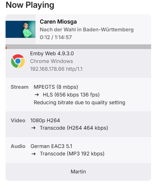 Emby Version 4.9.3.0 - Unraid 7.3.2 CPU is Intel® Xeon® CPU E3-1225 v6 @ 3.30GHz, which was working well with Plex before. I have Premiere lifetime if that is of interest: Recently I started converting some recorded TV episodes to a more "friendly" format, when I realised high CPU usage and very slow progress. Does it mean that HW transcoding is not working? It should state the encoders, shouldn't it? I forwarded /dev/dri in unraid ...and I can also see the device inside the Emby container: When I force transcode a playback, I don't seem to have any kind of HW transcoding indication either: What am I missing here? Edit: Just fired up my Plex container on the same system, and iGPU/QuickSync transcoding works fine there... Edit2: Same on Version 4.10.0.5 beta hardware_detection-63908664531.txt