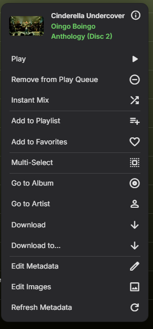 As I'm starting to use Emby more and more as a media player, I'm also starting to discover more and more features. I just now wanted to add the song I was listening to, to my favorites to see if I could try and use that feature. So I opened the tab and tried looking for the "add to favorites"-button: Hm, there doesn't seem to be an action to add the item to my favorites here? Maybe I'll check the playlist: Maybe the context menu? There it is! While making this post I also found out there's a hover-action on the album art, which also has the favorites and settings buttons: In my opinion it would be nice to have the "add to favorites"-button also within the player itself, always visible. If it took me a little while to find these I can imagine other, less tech-savvy people not being able to find them at all.