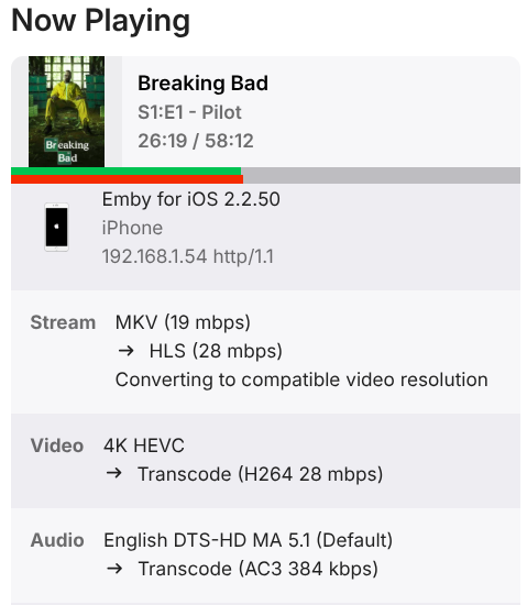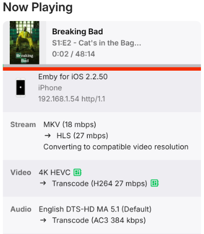 SDR content briefly showed the green "hardware acceleration" icon in the dashboard, but it disappeared almost instantly. Restarting the stream does not seem to make the icon reappear, but starting a completely new episode very briefly shows the icon (<1 s) ffmpeg-transcode-cc8831af-cf45-4d26-be71-0ffd843e4053_1.txt -