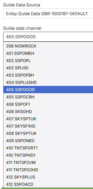 Similar to the post Sky Sports Premier League, looks like Gracenote is doing a big clean up. Previously I was using GBR-1000016-DEFAULT but that guide is blank now and doesn't even show as an option in Emby when trying to add new guide data. Replaced it with GBR-1000197-DEFAULT which is the Sky Q for any London (and surround area) post codes (E.g. W6). There are a few Issues with GBR-1000197-DEFAULT There is a bunch of channel number duplication from 402 upwards. Sky Sports Cricket and Golf are both showing as being on channel 405. EPG data is correct for each respective channel, just a number duplication. Sky Cricket was traditionally on 404 Also none of the Sky Sports F1 listings work any more either at 406 SSPOF1 or 407 SKYSF1HD (same number as Sky Sports Tennis (407 SKYSPTUK)). Now the guide data is only showing "Sky Sports F1 in HD on 507 from February 24". 507 is NHK World News and there are no other Sky Sports F1's in the list (that I could see with some slow scrolling through).