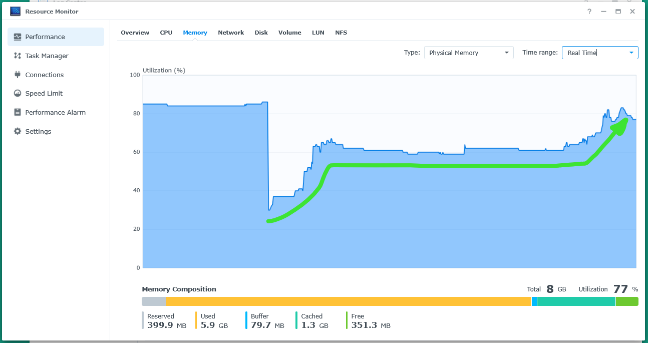 Hello Emby team, After some Synology applications were dropped/shut due to lack of memory on my DS920+ (8Gb memory), on 12-march I realized EmbyServer service was using >4GB of memory. Reading through topics I tried most suggestions: reduced the scanning library refresh intervals, removed unnecessary plug-ins, reviewed DB Cache and lines analysis - apparently the situation stabilized - so I thought - Got to 40% utilization, gradually increasing, decreasing... around 60% within manageable boundaries. Even to minimize overall NAS, I added 2xNVMe and pinned the BRTFS (where most of the library is stored). This also apparently attenuated the symptoms for a couple of days (up to 60% memory utilization - around 2.5Gb for Emby). However, this morning, without any specific user peak (2-3 simultaneous) or library scans, the memory utilization spiked again to >85% (3.5Gb for Emby) - then other Synology services were impacted (Universal Search and Indexing - which already have only music and photo folders indexed to minimize the consumption). Looking through Synology LogCenter, there's no other services behaving differently - only Log Center a little higher than usual, from 200Mb to 300Mb, but these 100Mb are far from being the cause. Then, I fully shutdown EmbyServer and the memory usage dropped to 30% immediately as expected. After start EmbyServer again the memory spiked faster than ever in 10 minutes with only 1 user as you can see per the green arrow in the chart below. I'm attaching the EmbyServer Log and a few snapshots to help elucidate this: - Real-Time Memory Utilization Resource Monitor when the server at 80%, shut, restarted and went from 30% to 60-ish% in a15 min. Weekly History range of memory consumption - March 13th midnight around 50%, peaked up to 85%, a first restart 14-mar 8AM, and the most recent in the right. 100% SSD Cache hit rate since the restart. (Expected since BRTFS is pinned) Considering many other testimonies and topics in the forum, seems like a common issue related to multiple plug-ins, library loops, database cache, but nothing seem to match my particular scenario. Is there any way other than run EmbyServer in Docker, that I could do limit the memory consumption on the native application of Emby ? I'd really like to avoid migrate to another docked instance to prevent that - since there are also some other performance related topics with this architecture I'm now running 4.10 - don't recall version 4.9 and under having such memory growth either (I've been running emby since 4.7 for more than an year without any significant changes in the library size and plug-in adoption) - would downgrade to 4.9 be an option ? Glad to try any other suggestions and advices. Thank you in advance, embyserver.txt- 2 replies