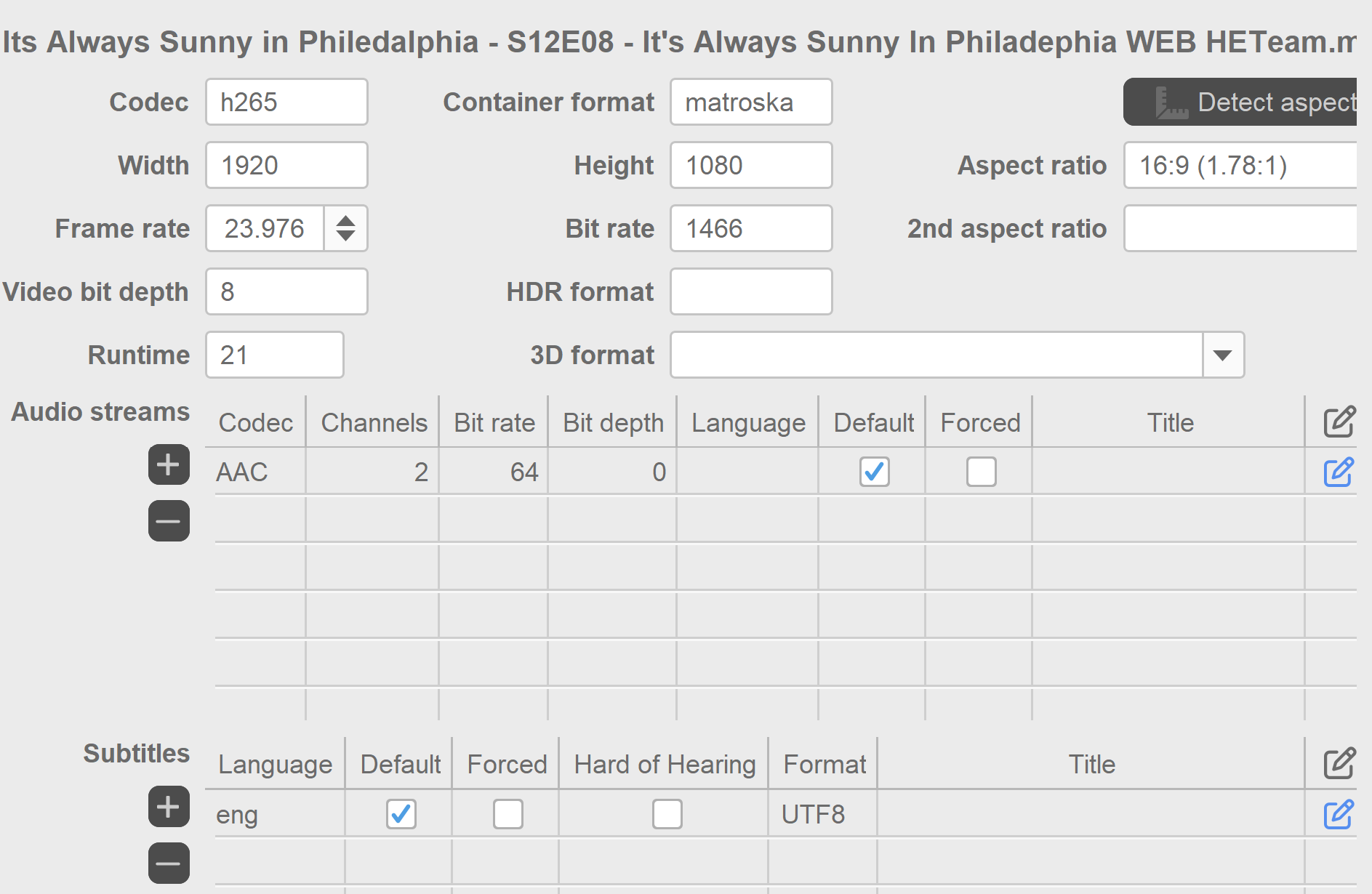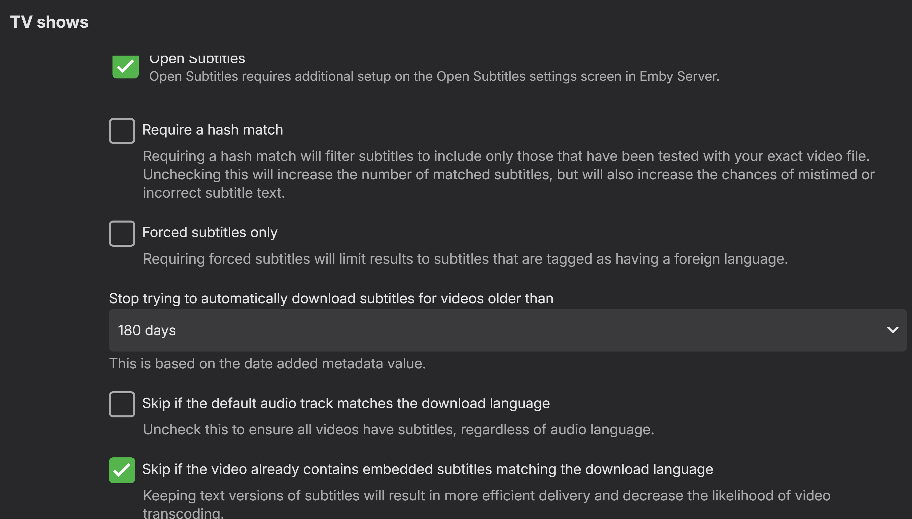 I believe Emby is always downloading fresh subtitles for shows. Which is generally fine. But some entire series never match up, while the internal subtitles work fine. Problem is, no matter what settings I change it will still download subtitles. I have the setting to skip if the video already contains subtitles matching the preferred language, which is english. Attached is I think all the relevant settings for this. I checked in Tiny Media Manager and the only internal default subtitles weren't set to English. So I set to English, deleted the .srt that Emby downloaded, and rescanned library files. And it just keeps downloading the .srt and setting that as the default. I've tried 10 different ways. Am I missing something obvious? I just want to use the embedded ones because it never manages to find correct ones on its own. I gave up on Plex ages ago because the subtitle system barely functioned, but I feel like Emby has gotten worse at it over time -