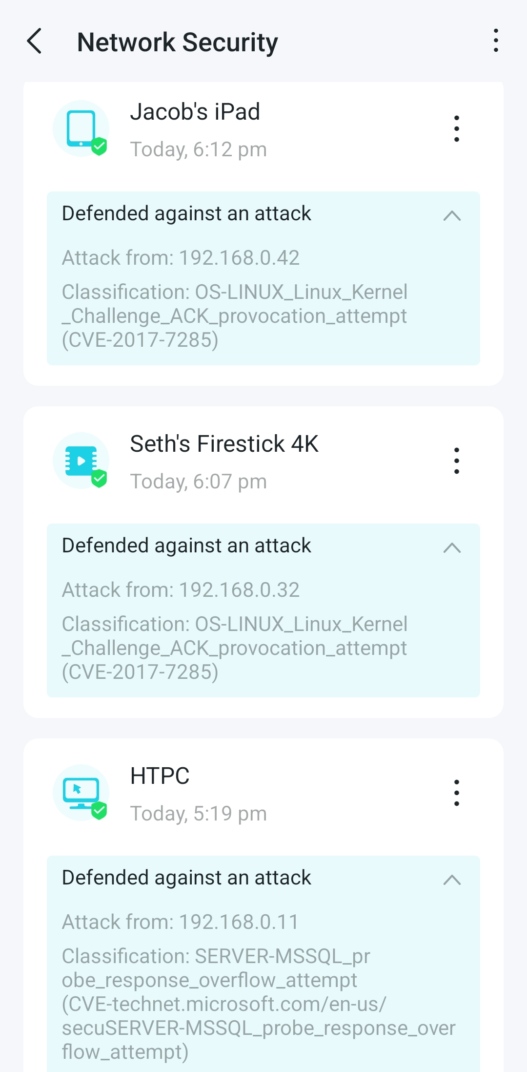 Biomorph 6 Posted October 13 Posted October 13 (edited) I too have an issue with a Firestick, fails to connect when all other devices have no issue. I tried to connect via the Amazon Silk browser to the local address but it failed with a 'took too long' message, tried to connect to another service on a different port and was successful. When I tried to connect via my external IP address it then worked immediately. Taking ebr's comment about network changes into consideration the only thing I could thing of was a firmware update on the TP-Link M5 mesh system I use. This system has some network security features and so i tried turning them off to see the result and sure enough the client running on the Firestick would then connect. Whilst connected I could play file etc. but within a few seconds of reenabling said security features playback would not work, I could still browse my library but not play anything. I then looked at the threats recently blocked and could see details as per the screen shot attached. There were threats reported for the Firestick as well as my server and also for an iPad. I recently had an issue with two iOS devices (one being this iPad) that would connect fine but would not playback files, giving a 'no compatible streams' error. This was rectified by enabling a setting for 'Local Network' access on both these devices. The iPad in question is still playing files but I find it odd seeing the exact same 'threat' for this device as the treat listed for the Firestick. I am unsure though if this is solely an issue with a firmware update from TP-Link or if it also relates to the latest update to Emby Server, both of these updates were releases fairly close in time however looking at the release notes for the latest update from TP-Link (https://www.tp-link.com/us/support/download/deco-m5/#Firmware) it appears there was a major update followed by a minor update that "Fixed a bug causing security protection to generate false positives." Edited October 13 by Biomorph 1