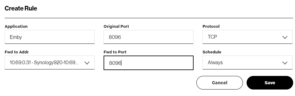 @howieT82You want to make sure you see both a local and remote address being shown on the Emby Dashbord. In the network menu settings you want to have: "Allow remote connections to this Emby Server" should be checked/enabled. "Enable automatic port mapping" should be unchecked/disabled Some builds of Emby Server (because of OS/requirements) do not allow changing the local ports and always use 8096 & 8920. Synology and some other NAS builds will not have local ports shown but are set already to 8096 and 8920. If Local http port number is shown, set to: 8096 If Local https port number is shown, set to 8920 Public http port number: 8096 Public https port number: 8920 Leave these fields blank External domain: Custom ssl certificate path: Certificate password: Secure connection mode: Remote IP address filter: Internet streaming bitrate limit (Mbps): Secure connection mode: Disabled Max simultaneous video streams: Unlimited Remote IP address filter mode: whitelist "LAN networks:" is likely already set to: 10.0.0.0/8, 192.168.0.0/24 and should be left alone "Local IP address:" leave this blank for now which will make Emby Server use the default IP of the machine. Can be useful but don't worry about that right now. Click the SAVE button. You can remove the "Port Mapper" plugin as we will not be using it. Restart Emby Server After Emby Restarts you should see both InHouse and Remote connections on the Dashboard, both using IPs and port 8096. If you do this on both the PC and the NAS, they should both show the same Remote address which is fine but only one will be in use with the other at the ready as a spare. How you perform the next step is going to be different depending on your router but briefly you want to: Login to your router, go to advanced settings, find the screen used to setup Port Forwarding. If there are other ports already setup for 8096 or 8920 remove them. You will now setup 1 new port forward. Every router does this it's own way but essentially you want WAN/External IP Port 8096 -> IP running Emby Server Port 8096 TCP Protocol Here is an example during Setup of a Verizon Router. Note the forwarding address is selected by a dropdown list where you can see the Synology 920 was chosen. NOTE: You can set the forward to Address as either the PC or NAS address. Ideally you will have the PC as the Primary Server running Emby but also have the Synology setup and working that is your backup system. If you ever have a problem with the PC you can quickly edit this Port Forward rule changing only the Forward to address pointing it to the NAS instead of the PC and it will get used instead. In a browser open a tab and go to either https://portchecker.co/ https://canyouseeme.org/ Change the port to 8096 and run the test. If it shows open then you should be all set. If you are going to have a primary and backup server test both IP after adjusting the port forwarding rule in the router. If the test shows closed port you need to reviews the steps again to see if you missed something. There are reasons you can fail the port test including: ISP has you behind a CGNAT You are running a VPN You have firewall rules in place on the router or local machine You are running some type of security software that is interfering Try the above and let us know how you make out.1 point