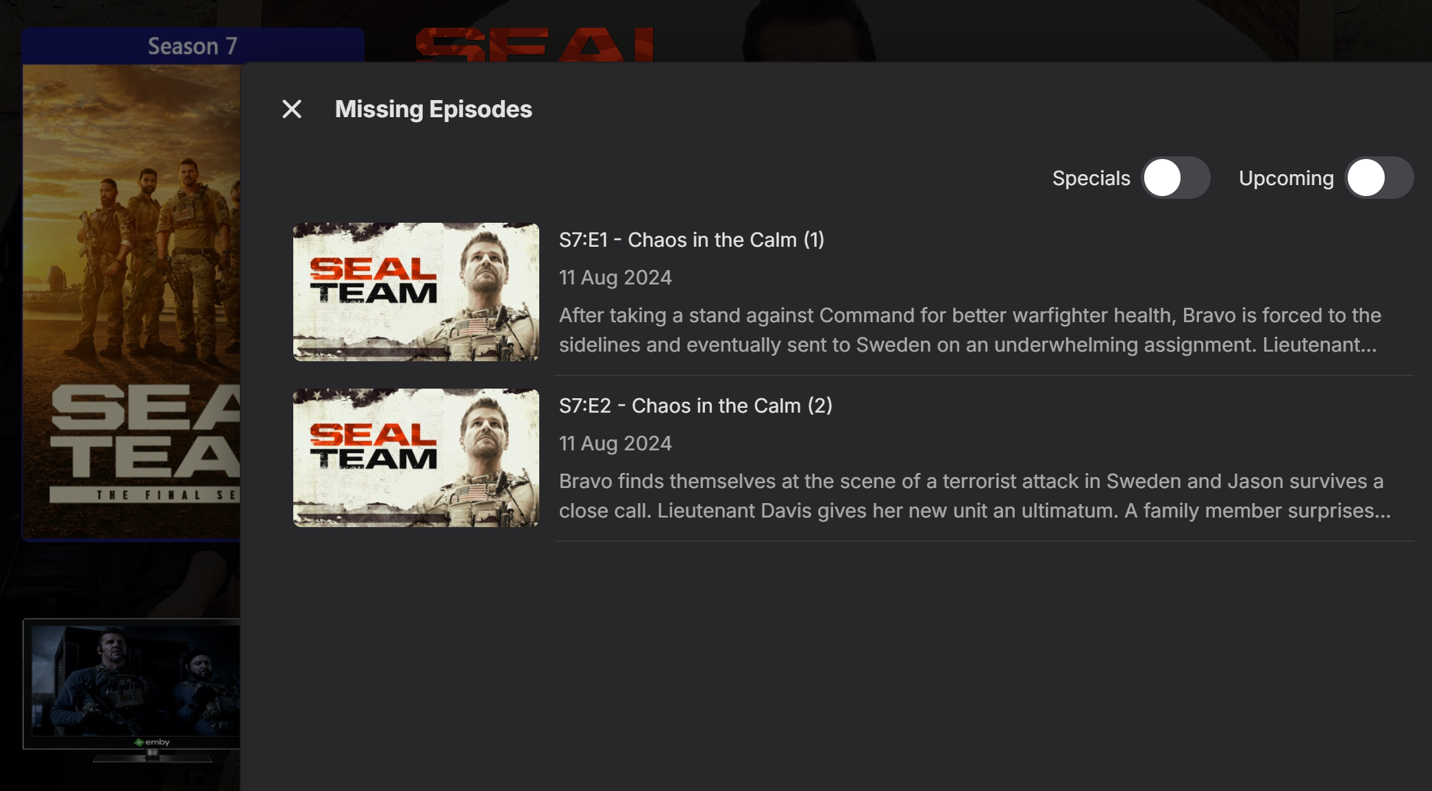 FredrikT 24 Posted August 23, 2024 Posted August 23, 2024 14 hours ago, ebr said: Hi. There is a display option in the Android TV app to show missing episodes. However, it will only show intermediate missing episodes. Which means, if the only missing ones are the last ones in your library, it won't see those. On the Android app, there is an option for missing episodes "hidden" in the menus, yes. But why can't we enable Emby to show missing episodes directly as an option, as it used to be? On Android for TV, which we primarily use, I can't find any options for this. See under. If I go into season 7, there's no three dots.