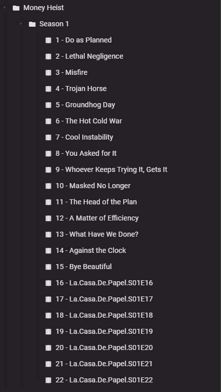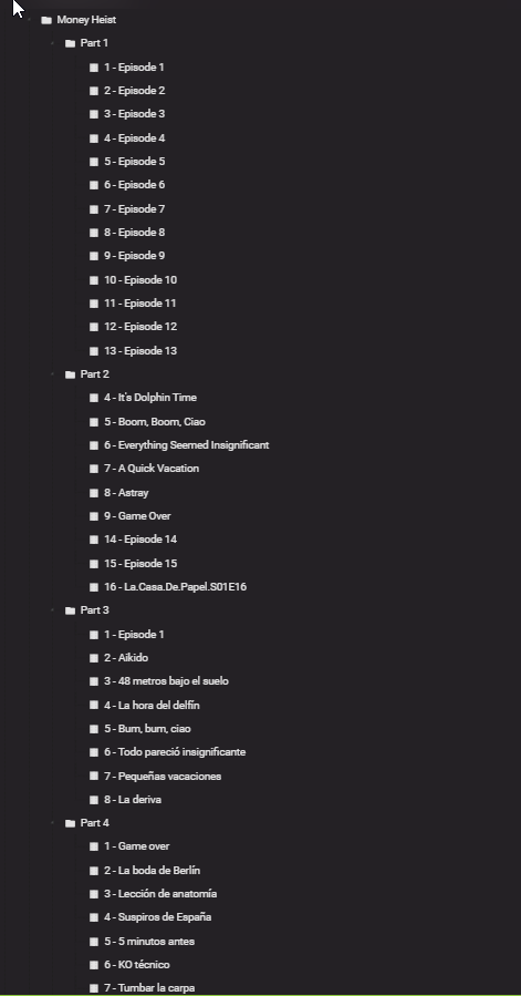 rbjtech 5284 Posted July 29, 2021 Posted July 29, 2021 (edited) Simply because there is no E16+ in Season 1. The files you have are named incorrectly. You need to match it to a metadata provider. https://www.thetvdb.com/series/la-casa-de-papel Look in 'Seasons' on the above link - you'll note various 'Orders' - you need to match the files and name the Season and Episode accordingly - you may have the Neflix 'cut' or you may have the original Spanish broadcast 'cut' - both having a different number of episodes ... Edited July 29, 2021 by rbjtech 1