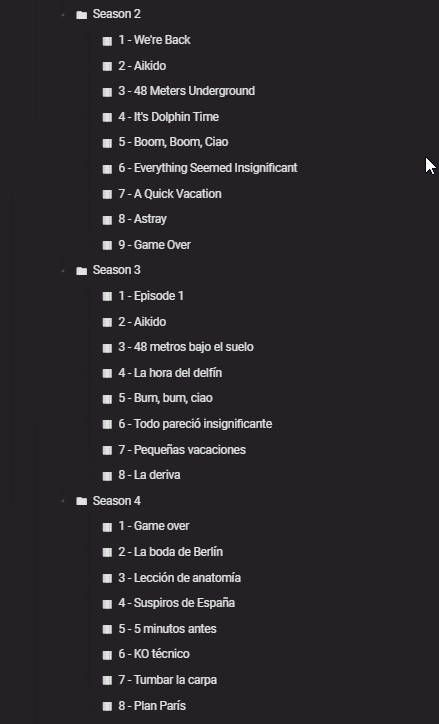 msauve 9 Posted July 29, 2021 Author Posted July 29, 2021 3 hours ago, rbjtech said: Simply because there is no E16+ in Season 1. The files you have are named incorrectly. You need to match it to a metadata provider. https://www.thetvdb.com/series/la-casa-de-papel Look in 'Seasons' on the above link - you'll note various 'Orders' - you need to match the files and name the Season and Episode accordingly - you may have the Neflix 'cut' or you may have the original Spanish broadcast 'cut' - both having a different number of episodes ... Hi @rbjtech, Thanks for the clue. I have the netflix one. Could you please guide me through the processe of naming by an example and by showing me where on TVDB should I be seen the naming and all this stuff. Because to be honest I’m not really used to be using these kind of databases. Usually everything is done by itself:/ Thanks!