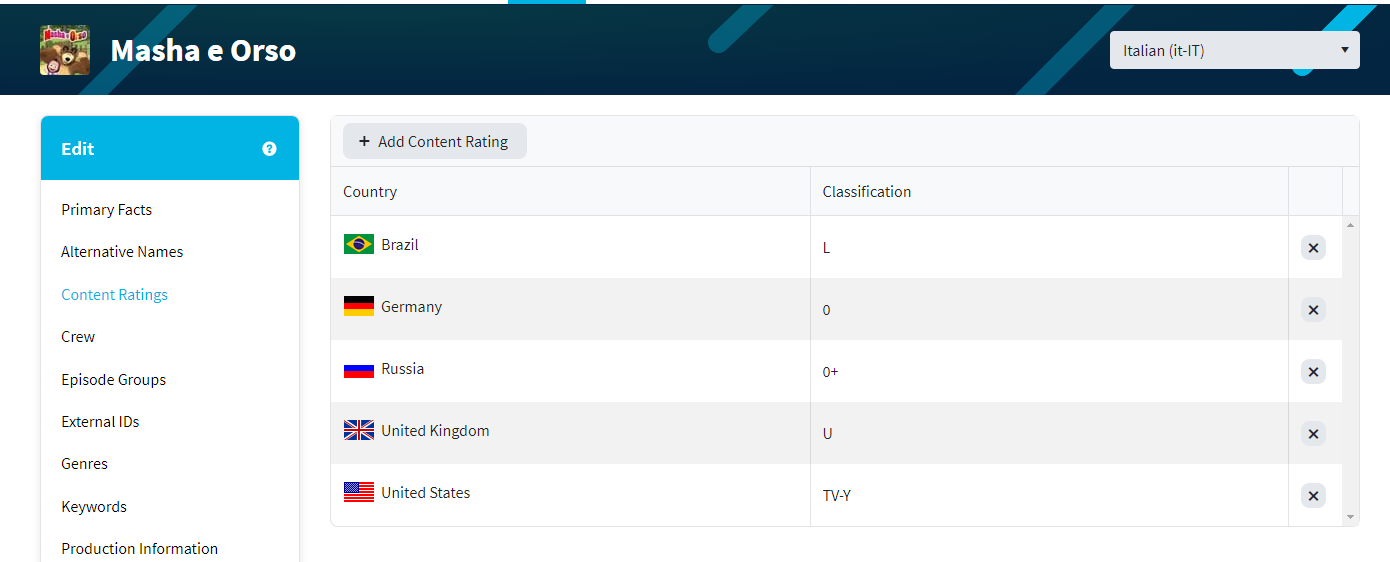 Bazzu85 22 Posted December 20, 2022 Author Posted December 20, 2022 1 hour ago, Happy2Play said: But per the linked wiki what is 0+? Where is 0+ coming from? Unless defined it would be an Unknown rating. Good point. I think that is from the russian (show origin) rating: https://rating-system.fandom.com/wiki/Russian_Age_Rating_System#:~:text=0%2B rating uses black text,16%2B correspond to traffic lights. The show on TMDB is marked as 0+ https://www.themoviedb.org/tv/46080?language=it-IT