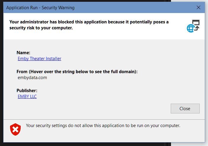 Happy2Play 9780 Posted August 17, 2021 Posted August 17, 2021 1 hour ago, rekit said: this one? https://emby.media/emby-theater.html I tried installing while logged into windows as administrator, but windows blocks it with an "application run - security warning" error. I disabled windows defender, ran it as administrator, and even ran it via an administrator command prompt but still get the same warning. "your administrator has blocked this application because it potentially poses a security risk to your computer." You mean error similar to this? Unable to Install ClickOnce Application due to Security Settings (Windows 10) - Super User 6 minutes ago, cayars said: That's common on Windows. There should be a link/button on the message MORE INFO or something like that you can click on. Then you can override and allow the installation. Not necessarily, as there were lot of topics awhile ago one this Windows config. 1