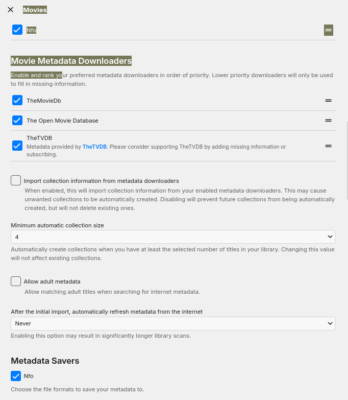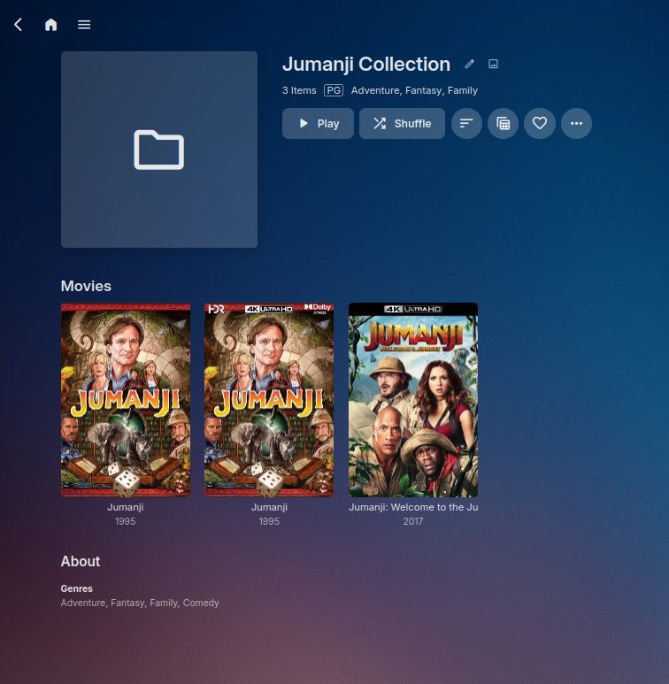 Happy2Play 9780 Posted October 4, 2024 Posted October 4, 2024 18 hours ago, Madtitan said: Hey Luke, yes it did. With the setting off, and manually deleting the collections in that TAB, I was doing re organizing of the media, updating certain subs/movie names, and also changing their folders. Once the media is moved to a different HD, or folder and Emby Rescans, it gets created. For example now. I just re encoded my Jumanji movies, to 60fps and did the Ai enhance. The replacing of the old files, triggered the collection folder creation and again, the setting was unchecked a long time ago. And thank you for your follow up. Need to go over library settings, but if there is existing metadata Emby will always read it even if option is disabled. So we would need to see the nfo file for Jumanji if you write nfo files. But can say I cannot have Emby create any collections with library option disabled and movie metadata not containing the Required <set> node to create a collection in 4.8 or 4.9. 1 2