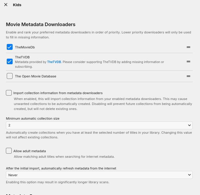 Happy2Play 9780 Posted September 25, 2024 Posted September 25, 2024 (edited) 12 hours ago, Madtitan said: CONFIRMING, this theory of disabling on the library, still produces the Collections LIbrary on its own. Regardless if its a fresh install or an old one. Tried in a LInux Container and on WIndows VM. Collections can only be made per existing metadata, provider metadata or manually. So one of those conditions have to be meet ie the <set> node in any item metadata and the library is made, there is no stopping that beside ensure the minimum value is high enough to no make collection. But in the end this virtual library is controlled by the server not the user per metadata. So the question becomes what did you confirm? But devs potentially need to add a higher value to not create collections at all even when metadata is present. Edited September 25, 2024 by Happy2Play