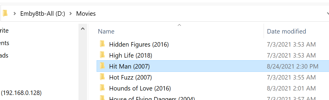 JeremyR 11 Posted August 24, 2021 Posted August 24, 2021 I was looking at rerendering a few movies. "Hit Man" was one of them. I wanted to see the data Emby displays to make a decision. Did a search, nothing. Did a alpha display of all movies... nothing. Directory of Movies... There it is with Emby files. Scanned library. Same outcomes. Picts and logs below. I also tried deleting Emby stuff in the subdir and scan... nothing. Cut subdir to a temp dir and scan and cut it back and scan... nothing. Hoping "Hit Man" is not a new key phrase in Emby. embyserver.txt