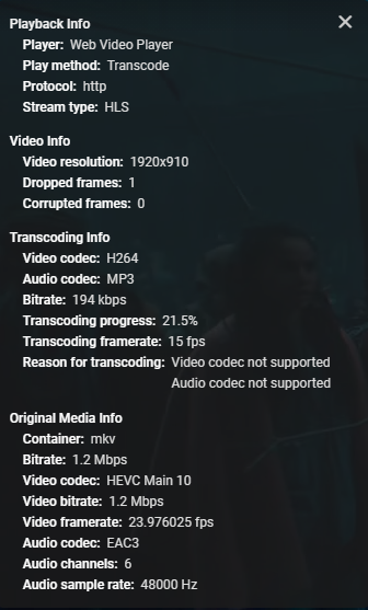 Carlo 4560 Posted August 25, 2021 Posted August 25, 2021 14 hours ago, shadowfire36 said: I have notice that i cannot properly play HEVC 1080p files. Any video I have in this format seems to freeze when playing . 720p hevc or any other 1080p stream seem to work fine within my Emby server . I have tried different browsers , different video cards ,and Emby theate. Tthe only way i can get them to play is with an external player through Emby theater. There another way to play this format , seems to be the only format i seem to have an issue with . In addition to what ebr posted above let us know what OS you have Emby Server installed on and give us a brief description of the PC/NAS running Emby Server. (ie i7 PC or Synology DS920+ NAS)