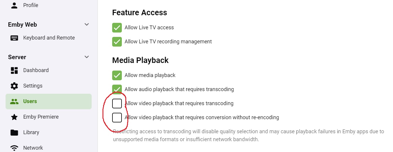 rodainas 191 Posted August 26, 2021 Posted August 26, 2021 36 minutes ago, Chenc033 said: Go to server settings, users, select user, go to media playback section, disable allow video playback that requires transcoding. 1