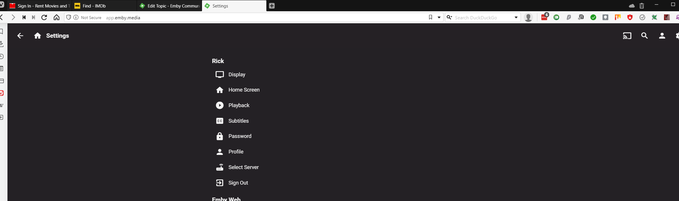 JeremyR 11 Posted September 2, 2021 Posted September 2, 2021 (edited) In Emby Theater switching server is clicking on the torso icon and finding the "Select Server" choice just above "Sign Out". In the Browser you hit the torso icon and you get the same basic list sans select server. Is there another way to get to an alternate server? There's more to this than I thought. I was using the torso image in browser and when the page came up black, I had a "Select Server". When the torso page comes up white the list doesn't have "select server"... Edited September 2, 2021 by JeremyR add detail