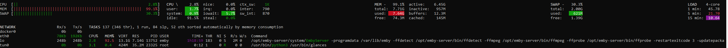 dfou2 0 Posted September 8, 2021 Author Posted September 8, 2021 (edited) My emby server just crashed again, without any logs this time... I don't understand what's happening... it ends with : 2021-09-08 12:53:17.350 Debug Server: http/1.1 GET http://XXX.XXX.XXX.XXX:8096/dlna/681f6ff2-2841-4398-a991-e67f399a7d5b/description.xml. UserAgent: Linux/4.19.0-5-amd64 UPnP/1.0 Cling/2.0 2021-09-08 12:53:17.367 Debug Server: http/1.1 GET http://XXX.XXX.XXX.XXX:8096/dlna/681f6ff2-2841-4398-a991-e67f399a7d5b/description.xml. UserAgent: PlexMediaServer/1.24.1.4931-1a38e63c6 2021-09-08 12:53:17.489 Debug Server: http/1.1 GET http://XXX.XXX.XXX.XXX:8096/dlna/681f6ff2-2841-4398-a991-e67f399a7d5b/description.xml. UserAgent: PlexMediaServer/1.24.1.4931-1a38e63c6 2021-09-08 12:53:17.590 Debug Server: http/1.1 Response 403 to 109.238.14.84. Time: 250ms. http://XXX.XXX.XXX.XXX:8096/dlna/681f6ff2-2841-4398-a991-e67f399a7d5b/description.xml 2021-09-08 12:53:17.590 Debug Server: http/1.1 Response 403 to 109.238.14.60. Time: 340ms. http://XXX.XXX.XXX.XXX:8096/dlna/681f6ff2-2841-4398-a991-e67f399a7d5b/description.xml 2021-09-08 12:53:37.828 Debug Server: http/1.1 GET http://XXX.XXX.XXX.XXX:8096/dlna/681f6ff2-2841-4398-a991-e67f399a7d5b/description.xml. UserAgent: DAFUPnP 2021-09-08 12:53:38.165 Debug Dlna: Using default profile for: Accept=*/*, Accept-Encoding=gzip, Host=XXX.XXX.XXX.XXX:8096, User-Agent=PlexMediaServer/1.24.1.4931-1a38e63c6 2021-09-08 12:53:38.165 Debug Dlna: Using default profile for: Cache-Control=no-cache, Connection=Keep-Alive, Pragma=no-cache, Accept=text/xml, application/xml, Host=XXX.XXX.XXX.XXX:8096, User-Agent=DAFUPnP 2021-09-08 12:53:38.455 Debug Server: http/1.1 GET http://XXX.XXX.XXX.XXX:8096/dlna/681f6ff2-2841-4398-a991-e67f399a7d5b/description.xml. UserAgent: PlexMediaServer/1.24.1.4931-1a38e63c6 2021-09-08 12:53:38.455 Debug Server: http/1.1 Response 403 to 109.238.14.146. Time: 0ms. http://XXX.XXX.XXX.XXX:8096/dlna/681f6ff2-2841-4398-a991-e67f399a7d5b/description.xml 2021-09-08 12:53:38.785 Debug Server: http/1.1 Response 200 to 178.170.42.161. Time: 957ms. http://XXX.XXX.XXX.XXX:8096/dlna/681f6ff2-2841-4398-a991-e67f399a7d5b/description.xml 2021-09-08 12:53:38.907 Debug Server: http/1.1 GET http://XXX.XXX.XXX.XXX:8096/dlna/681f6ff2-2841-4398-a991-e67f399a7d5b/description.xml. UserAgent: Microsoft-Windows/10.0 UPnP/1.0 2021-09-08 12:53:38.908 Debug Dlna: Using default profile for: Cache-Control=no-cache, Connection=Close, Pragma=no-cache, Accept=text/xml, application/xml, Host=XXX.XXX.XXX.XXX:8096, User-Agent=Microsoft-Windows/10.0 UPnP/1.0 2021-09-08 12:53:39.111 Debug Server: http/1.1 Response 200 to 178.170.42.161. Time: 204ms. http://XXX.XXX.XXX.XXX:8096/dlna/681f6ff2-2841-4398-a991-e67f399a7d5b/description.xml 2021-09-08 12:53:39.352 Debug Server: http/1.1 GET http://XXX.XXX.XXX.XXX:8096/dlna/681f6ff2-2841-4398-a991-e67f399a7d5b/icons/logo240.png. UserAgent: User-Agent: Microsoft-DLNA DLNADOC/1.50 2021-09-08 12:53:39.785 Debug Server: http/1.1 Response 200 to 178.170.42.161. Time: 433ms. http://XXX.XXX.XXX.XXX:8096/dlna/681f6ff2-2841-4398-a991-e67f399a7d5b/icons/logo240.png 2021-09-08 12:53:39.919 Debug Server: http/1.1 GET http://XXX.XXX.XXX.XXX:8096/dlna/681f6ff2-2841-4398-a991-e67f399a7d5b/icons/logo240.jpg. UserAgent: User-Agent: Microsoft-DLNA DLNADOC/1.50 2021-09-08 12:53:39.929 Debug Server: http/1.1 Response 500 to 178.170.49.41. Time: 22440ms. http://XXX.XXX.XXX.XXX:8096/dlna/681f6ff2-2841-4398-a991-e67f399a7d5b/description.xml 2021-09-08 12:53:39.969 Debug Server: http/1.1 Response 200 to 178.170.42.161. Time: 50ms. http://XXX.XXX.XXX.XXX:8096/dlna/681f6ff2-2841-4398-a991-e67f399a7d5b/icons/logo240.jpg 2021-09-08 12:53:39.971 Debug Server: http/1.1 GET http://XXX.XXX.XXX.XXX:8096/dlna/681f6ff2-2841-4398-a991-e67f399a7d5b/icons/logo120.png. UserAgent: User-Agent: Microsoft-DLNA DLNADOC/1.50 2021-09-08 12:53:40.019 Debug Server: http/1.1 Response 200 to 178.170.42.161. Time: 48ms. http://XXX.XXX.XXX.XXX:8096/dlna/681f6ff2-2841-4398-a991-e67f399a7d5b/icons/logo120.png 2021-09-08 12:53:40.036 Debug Server: http/1.1 GET http://XXX.XXX.XXX.XXX:8096/dlna/681f6ff2-2841-4398-a991-e67f399a7d5b/icons/logo120.jpg. UserAgent: User-Agent: Microsoft-DLNA DLNADOC/1.50 2021-09-08 12:53:40.088 Debug Server: http/1.1 Response 200 to 178.170.42.161. Time: 53ms. http://XXX.XXX.XXX.XXX:8096/dlna/681f6ff2-2841-4398-a991-e67f399a7d5b/icons/logo120.jpg 2021-09-08 12:53:40.109 Debug Server: http/1.1 GET http://XXX.XXX.XXX.XXX:8096/dlna/681f6ff2-2841-4398-a991-e67f399a7d5b/icons/logo48.png. UserAgent: User-Agent: Microsoft-DLNA DLNADOC/1.50 2021-09-08 12:53:40.109 Debug Server: http/1.1 Response 200 to 178.170.42.161. Time: 1ms. http://XXX.XXX.XXX.XXX:8096/dlna/681f6ff2-2841-4398-a991-e67f399a7d5b/icons/logo48.png 2021-09-08 12:53:40.111 Debug Server: http/1.1 GET http://XXX.XXX.XXX.XXX:8096/dlna/681f6ff2-2841-4398-a991-e67f399a7d5b/icons/logo48.jpg. UserAgent: User-Agent: Microsoft-DLNA DLNADOC/1.50 2021-09-08 12:53:40.111 Debug Server: http/1.1 Response 200 to 178.170.42.161. Time: 0ms. http://XXX.XXX.XXX.XXX:8096/dlna/681f6ff2-2841-4398-a991-e67f399a7d5b/icons/logo48.jpg 2021-09-08 12:53:40.117 Debug Server: http/1.1 GET http://XXX.XXX.XXX.XXX:8096/dlna/681f6ff2-2841-4398-a991-e67f399a7d5b/contentdirectory/contentdirectory.xml. UserAgent: Microsoft-Windows/10.0 UPnP/1.0 2021-09-08 12:53:40.364 Debug Server: http/1.1 Response 200 to 178.170.42.161. Time: 247ms. http://XXX.XXX.XXX.XXX:8096/dlna/681f6ff2-2841-4398-a991-e67f399a7d5b/contentdirectory/contentdirectory.xml XXX is the ip address from my server Do you have some hints ? And Emby is consumming all my ram.. strange Edited September 8, 2021 by dfou2