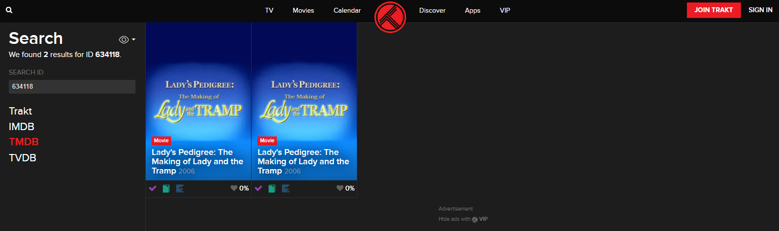 Solution Happy2Play 9780 Posted September 12, 2021 Solution Posted September 12, 2021 1 minute ago, roaku said: Interestingly, that search url resolves properly for Lady's Pedigree from IMDB id: https://trakt.tv/search/imdb/tt0778759 And Lady's Pedigree sidebar IMDB link *now* resolves properly too instead of linking to an IMDB search: https://trakt.tv/movies/lady-s-pedigree-the-making-of-lady-and-the-tramp-2006 That was quick, I will guess you can blame me for updating TMDB with that IMDB id. So Trakt is getting IMDB from TMDB.