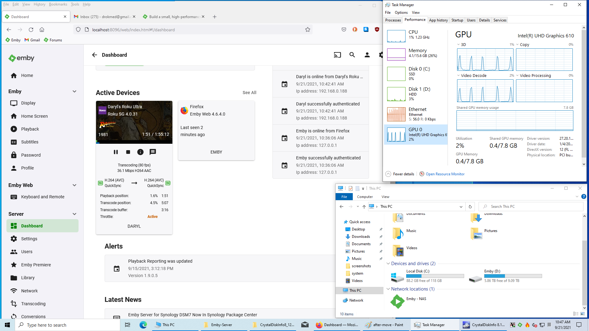 Bingie 99 Posted September 21, 2021 Author Posted September 21, 2021 Everything looks good. Move appears successful. Playing a movie on the roku, 1 transcode, NAS is basically idle, the gpu doing a little work.
