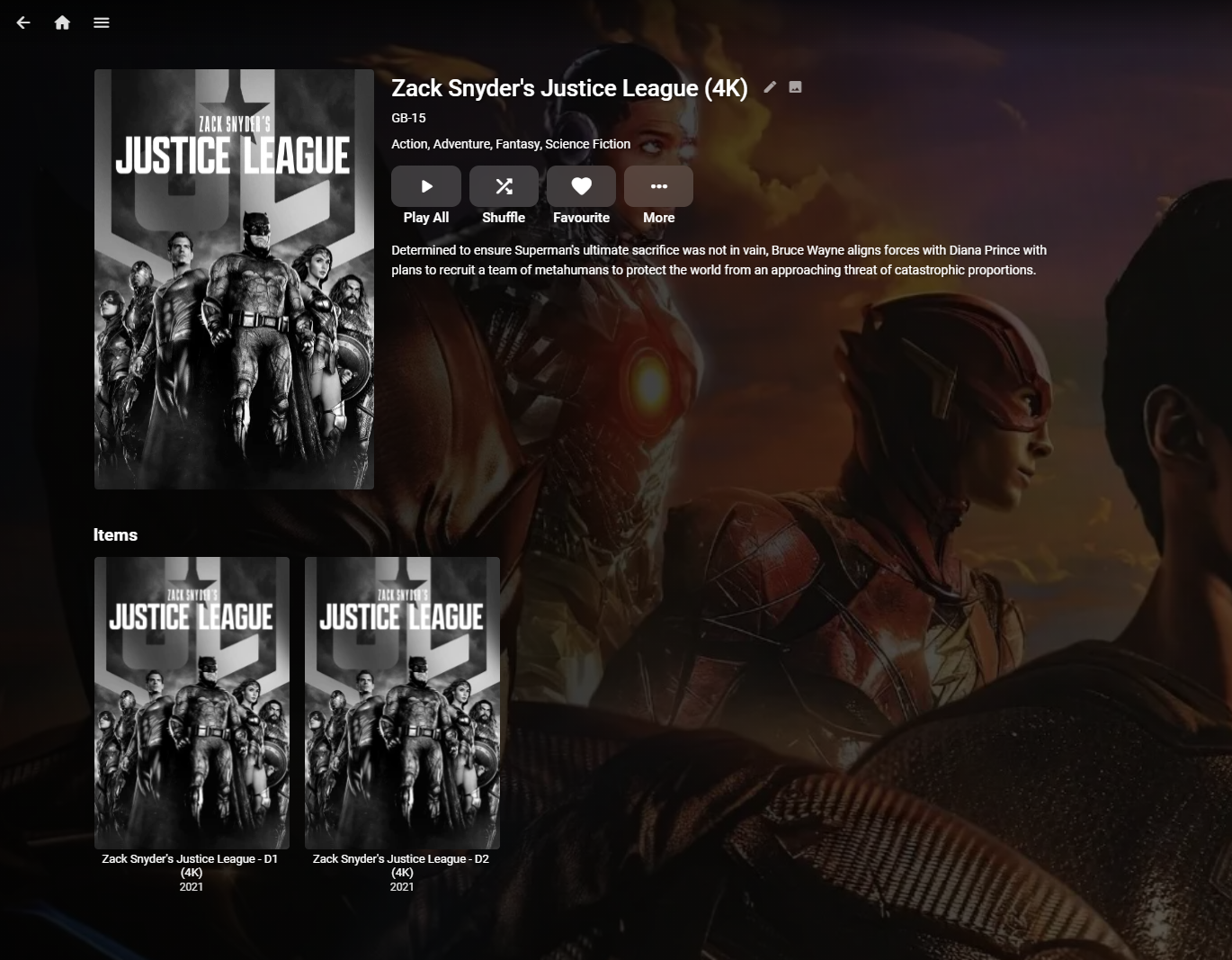 rbjtech 5284 Posted September 19, 2021 Posted September 19, 2021 (edited) Personally I now tend to keep these type of films as the intended two parts - same with films like Extended Editions of LoTR. Each part of the film then keeps it intended chapters and lets be honest, nobody is going to watch a 4hr film without a break .. I just put them both in the same folder - with a '- D1 or -D2' after the primary part of the filename - and then create a collection of them both called the same thing. Then you only get a single entry in your list of films but get to see both parts when selecting it.. Example file naming :- Directory of V:\Zack Snyder's Justice League (2021) [tmdbid=791373] 10/09/2021 23:17 59,568,008,668 Zack Snyder's Justice League (2021) - D1 - Bluray-2160p HDR THD 7.1.mkv 10/09/2021 23:38 41,339,473,378 Zack Snyder's Justice League (2021) - D2 - Bluray-2160p HDR THD 7.1.mkv Edited September 19, 2021 by rbjtech 1