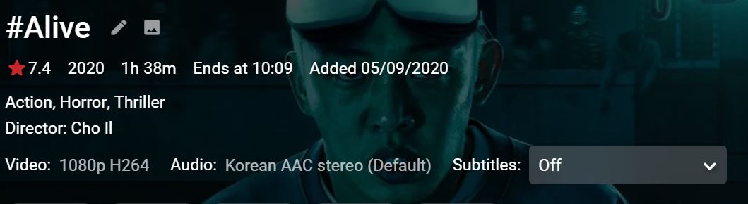 Hi all, just wondering if I might pick your brains re subtitles. Server side I have Smart Subtitles turned on, and my preferred subtitle language is English. The media file in particular, a Korean film (#Alive), has its stream audio correctly flagged as Korean, and this is detected within Emby. The external subtitle file I have is named as "#Alive (2020).eng.srt", following the established naming convention (media file is named as "#Alive (2020).mkv").