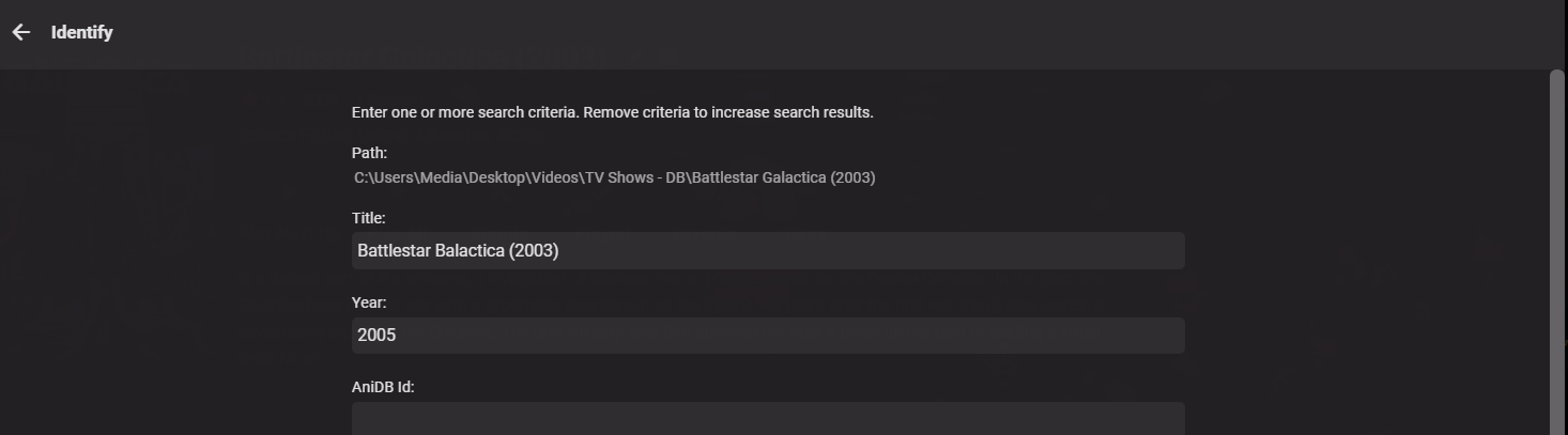 Happy2Play 9782 Posted September 29, 2021 Posted September 29, 2021 (edited) I am guessing there is a change to this series on TVDB as I had to manually Identify on my test system As you see Battlestar Balactica (2003) is not searchable for Identify. And to get it to Identify the series only you need to query name Battlestar Balactica (2003) and year 2005. Edited September 29, 2021 by Happy2Play