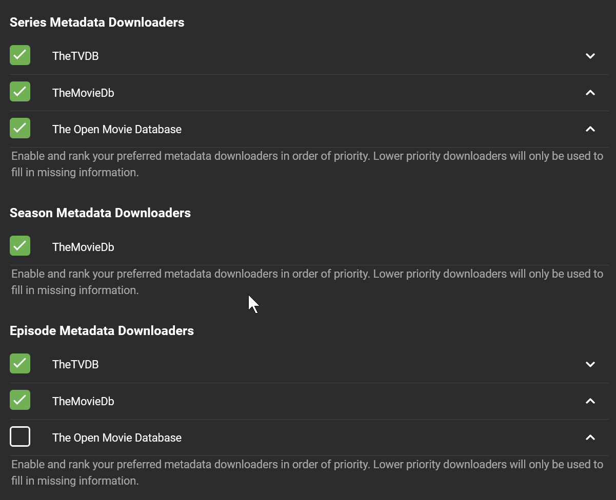 kevinw 8 Posted September 29, 2021 Posted September 29, 2021 I'm in the process of ripping the Battlestar Galactica Blu-Ray discs using TheTVDB as my naming guide. When emby picks up the Specials there is a mismatch between what's in TheTVDB and what is being displayed in emby. I eventually realised emby is displaying metadata from TheMovieDB, E.g. S00E01 and 02 are the two episodes of the mini series according to TheTVDB, TheMovieDB has them as The Lowdown and Deleted Scenes respectively, which is what emby displays. These are my settings: Have I misunderstood how this works or have you switched away from TheTVDB? I am aware of what TheTVDB is doing, I'm just trying to understand why the metadata is now what I expected. Thanks. Kevin