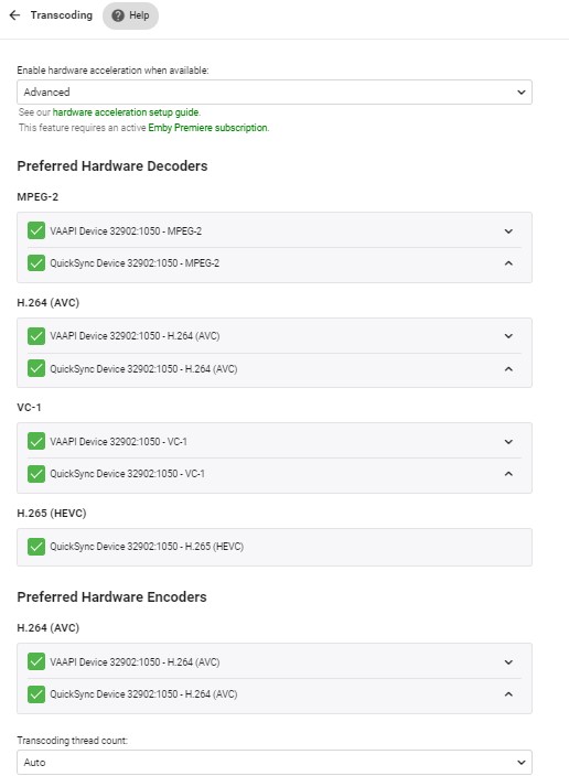 Happy2Play 9780 Posted October 1, 2021 Posted October 1, 2021 23:22:26.383 Error creating a QSV device 23:22:26.383 qsv hwaccel requested for input stream #0:0, but cannot be initialized. 23:22:26.383 Error while decoding stream #0:0: No such device or address 23:22:26.383 [AVHWDeviceContext @ 0x1514dc0] libva: /app/emby/dri/iHD_drv_video.so init failed 23:22:26.383 [AVHWDeviceContext @ 0x1514dc0] Failed to initialise VAAPI connection: 1 (operation failed). Info Previous transcoding attempt failed. Falling back to software transcoding. Will need comment from @Lukeor @softworkz