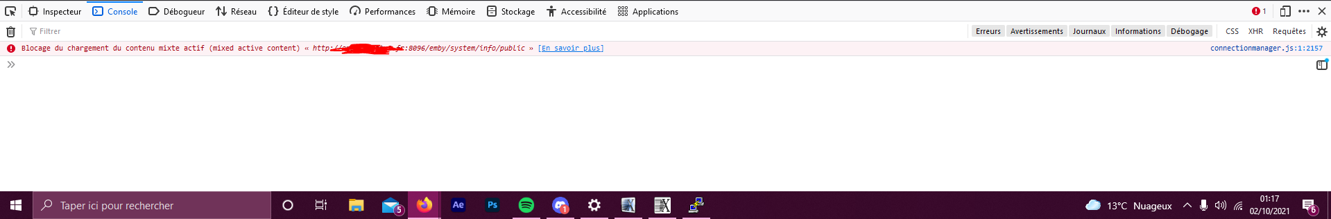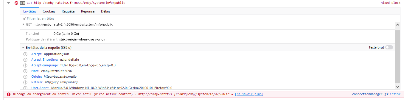CaffNoir 21 Posted October 1, 2021 Author Posted October 1, 2021 traduction : Blocking the loading of mixed active content "http://mydomain.fr:8096/emby/system/info/public"