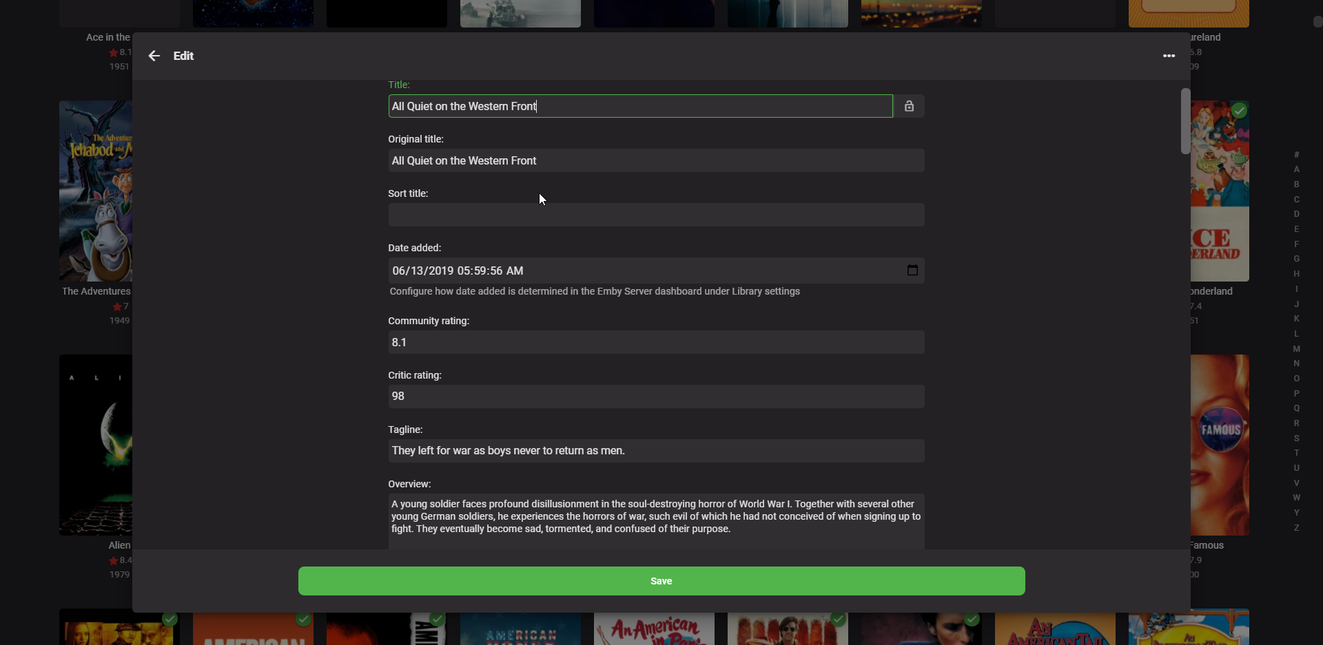 robertw3524 1 Posted October 14, 2021 Author Posted October 14, 2021 sure. in this screenshot there are 3 movies that no longer have photos, 2 that were auto done by emby and 1 that i added bc it was a best picture. the movie all quiet still has all it's metadata tho