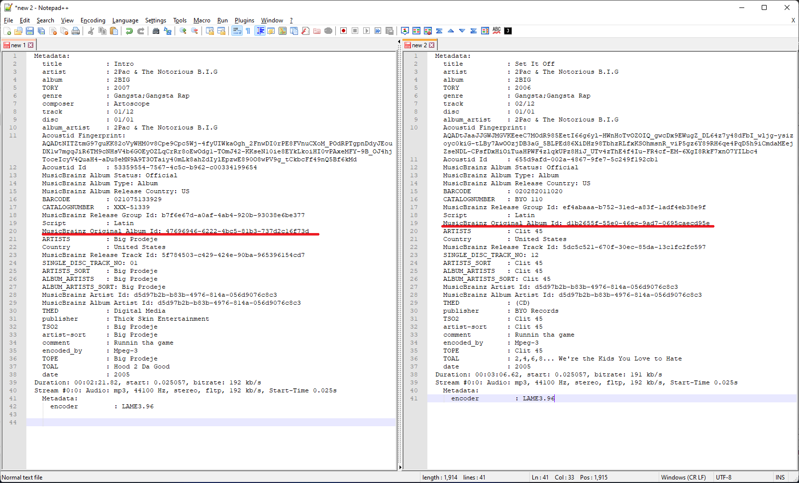 Luke 42078 Posted November 2, 2021 Posted November 2, 2021 1 minute ago, thelanranger said: Why are you using the releasegroupid? 90% of the mp3s I have have complete garbage in that slot like "ripped by jeff" or something. Is this EVERY tag? I need a complete list of 100% of the tags that are scanned. Is there somewhere that this can be looked up? Artist, album names, track numbers, album artists, etc etc etc. I need to know exactly how tags need to be written to the file and what needs to be removed (and what doesn't matter) in order to update everything that I have to be consistent please. A good starting point would be all of the tags written by the Picard software. But yes, stripping out any garbage values you may have will likely help.