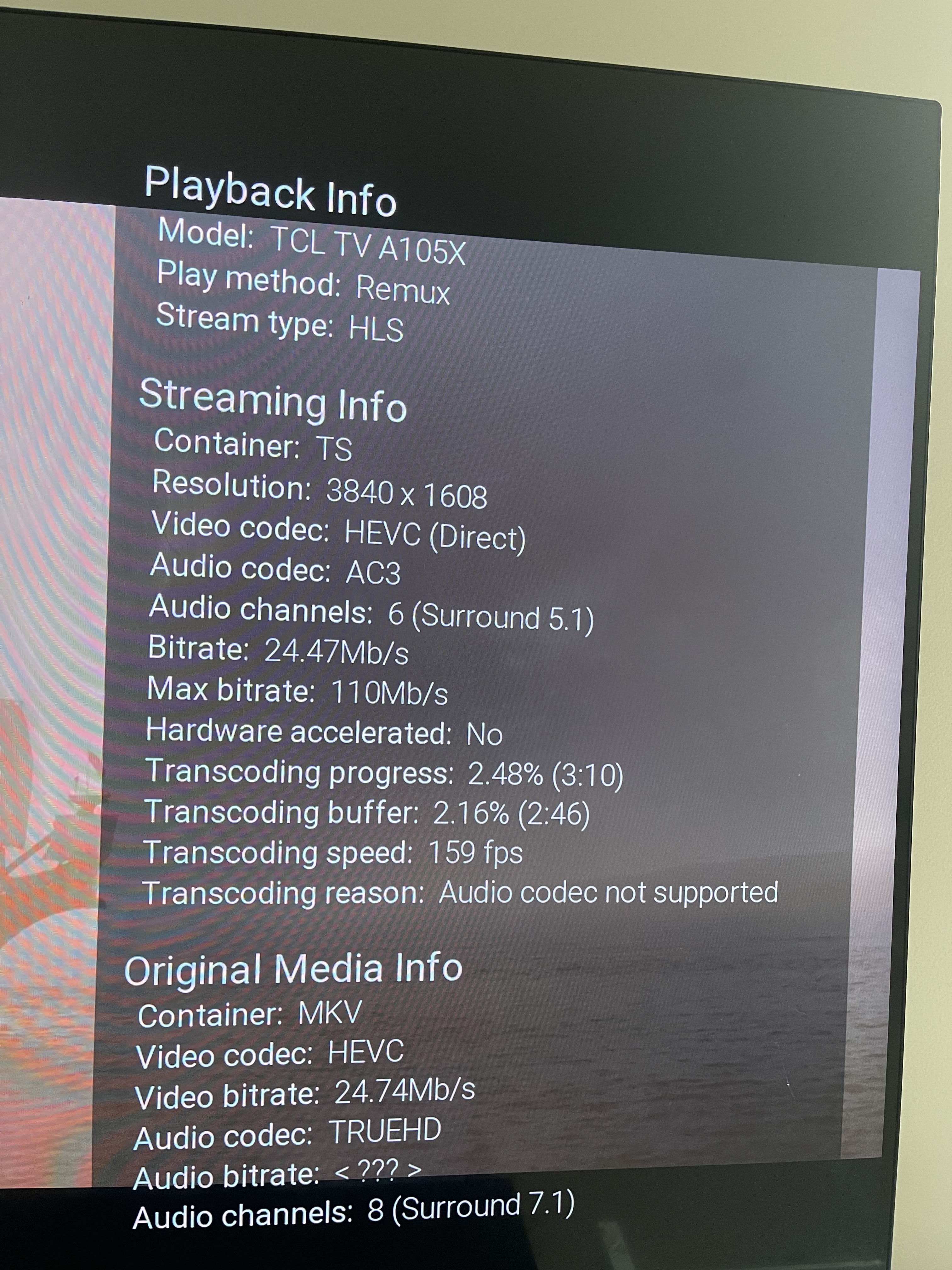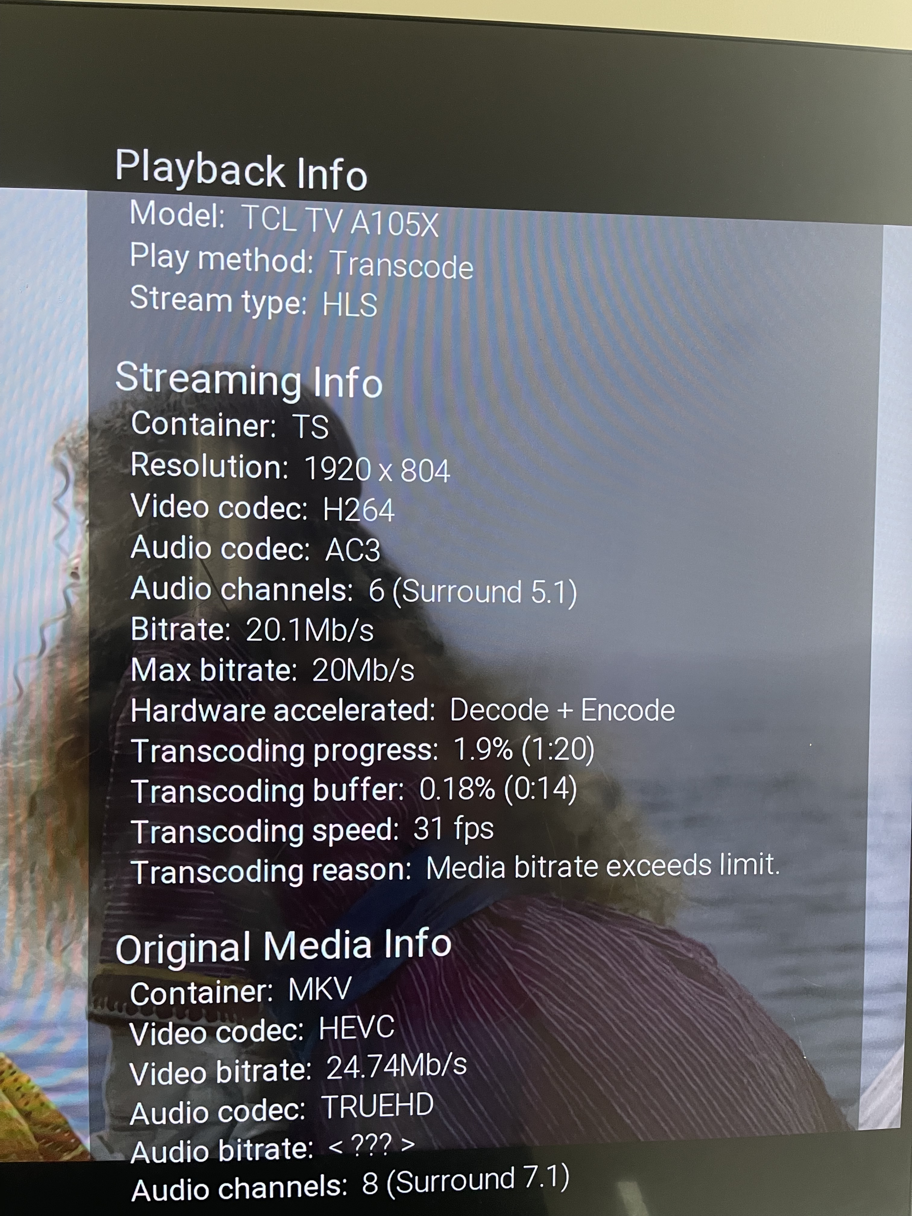 jdazzle44 7 Posted October 31, 2021 Author Posted October 31, 2021 1 hour ago, ebr said: Okay, so can you please provide details of an example that isn't working including exactly which app/platform that is? Thanks. How to Report a Problem Lets limit this to two platforms(4k Roku Tv and 4k Fire Stick). The movie I'm testing has a UHD bitrate of 25Mbps and a HD bitrate of 8Mbps. If I select the UHD version of the movie with any of the platform bitrate set to 25Mbps or more than it direct plays it with the exception of audio remux which isn't of a concern. Now if I change the bitrate to 20Mbps while the movie is playing, My Roku Tv transcode the UHD version to HD while the Fire Stick just switches to the HD version and direct plays it since the HD bitrate is less than the selected 20Mbps. I have attached pictures of both platform stats for nerds and also the logs. Interestingly, there is no log for when I originally direct play the UHD version on the Fire Stick which makes sense since there is no transcoding required but there is a log once I change the bitrate to 20Mbps. ffmpeg-remux-41e50a46-d027-4daf-b49c-a930e0bfc91b_1.txt ffmpeg-transcode-d38c040f-ac36-4ddd-a2d0-a3ec674e0249_1.txt ffmpeg-remux-c9d8d624-566a-4fee-bb26-8406600c1383_1.txt
